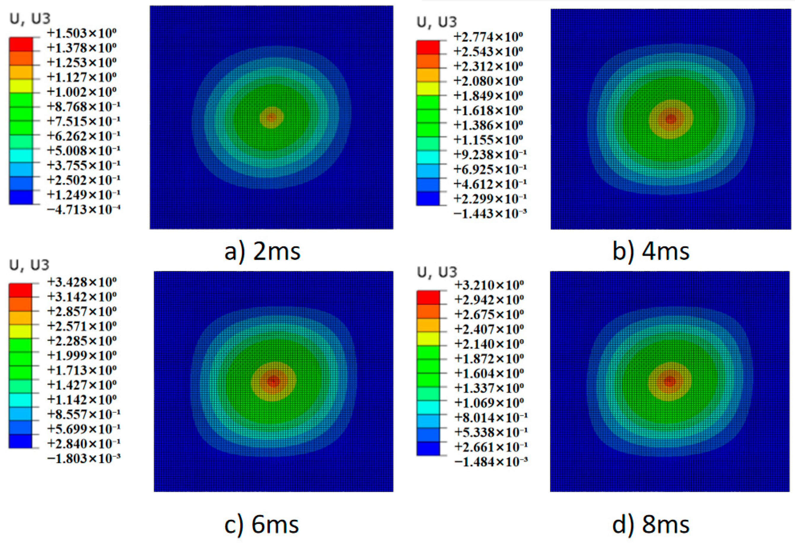Figure 6 displays the displacement contour of the CL at impact location L5, subjected to an impact velocity of 0.760 m/s (IE of 1.3 J). The impact velocity was directed along the +Z axis. The displacement pattern of the CL was characterized by an initial increase followed by a subsequent decrease over time. In the initial 0 to 6 ms interval, the kinetic energy of the punch was transferred into both kinetic and potential energy within the CL. Starting from a stationary position, the laminate moved together with the punch, with its displacement progressively increasing to reach a peak of 3.42 mm at 6 ms. Following this peak, the elastic potential energy stored in the laminate began to dissipate, converting back into kinetic energy, which affects both the laminate and the punch. This energy conversion resulted in the laminate and punch moving in opposite directions, leading to a gradual reduction in the laminate’s displacement.