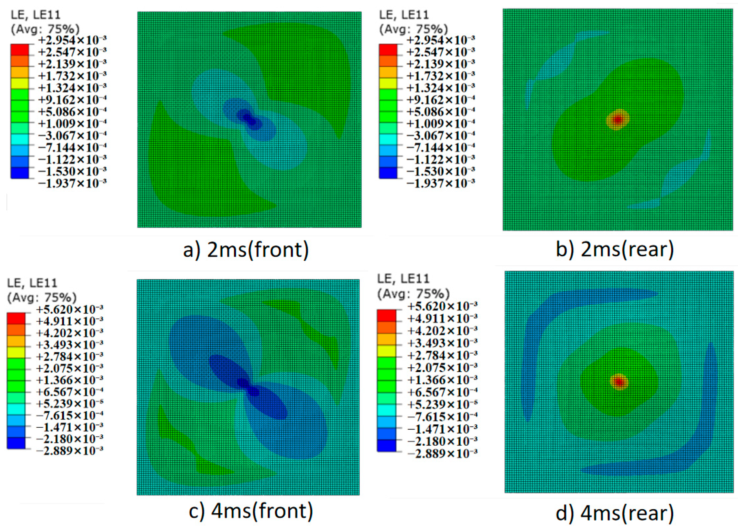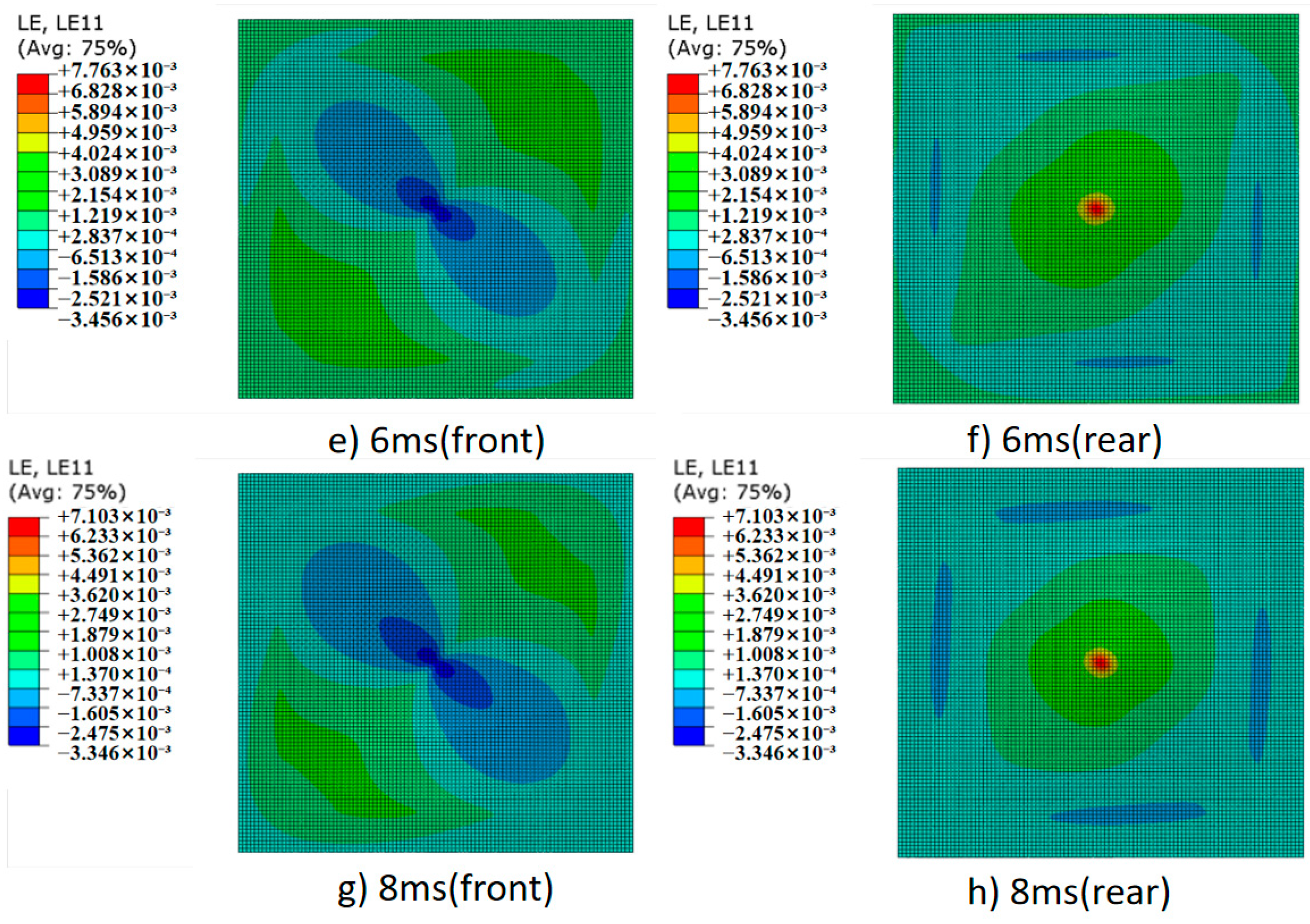 Figure 7 illustrates the longitudinal strain, LE11, of the CL subjected to an impact with an impact velocity of 0.760 m/s (IE of 1.3 J) at impact position 5. The strain in the CL initially increases and subsequently decreases over time. Within the 0 to 6 ms interval, the kinetic energy of the punch is transformed into both kinetic and potential energy of the CL, resulting in a gradual increase in the laminate strain. At the 6 ms mark, the strain peaks at values of 7763 μ and −3456 μ. Beyond this point, the elastic potential energy of the laminate was progressively released, converting back into kinetic energy for both the laminate and the punch, which led to a corresponding decrease in strain. A comparison of the strain distribution on the front and back surfaces shows compressive strain on the front and tensile strain on the back. The area exhibiting high compressive strain on the front was smaller than that showing high tensile strain on the back, suggesting that the back surface of the CL was under greater strain and, consequently, more prone to damage and failure.