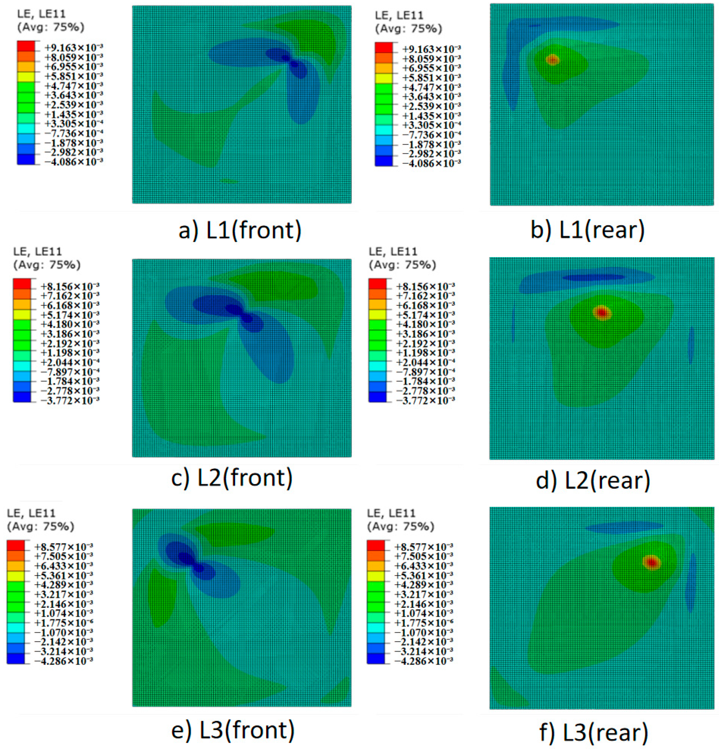Relative to other impact locations, the strain response at the central point of the CL (impact location 5) was found to be comparatively minimal. Upon impact, this location displayed a larger high-strain area on the rear surface of the laminate, indicating a higher susceptibility to damage and failure.