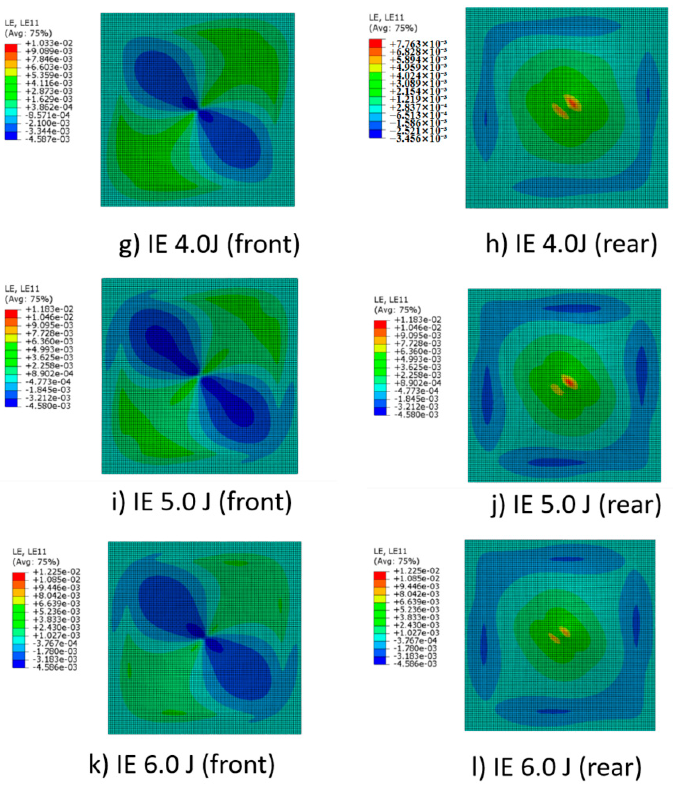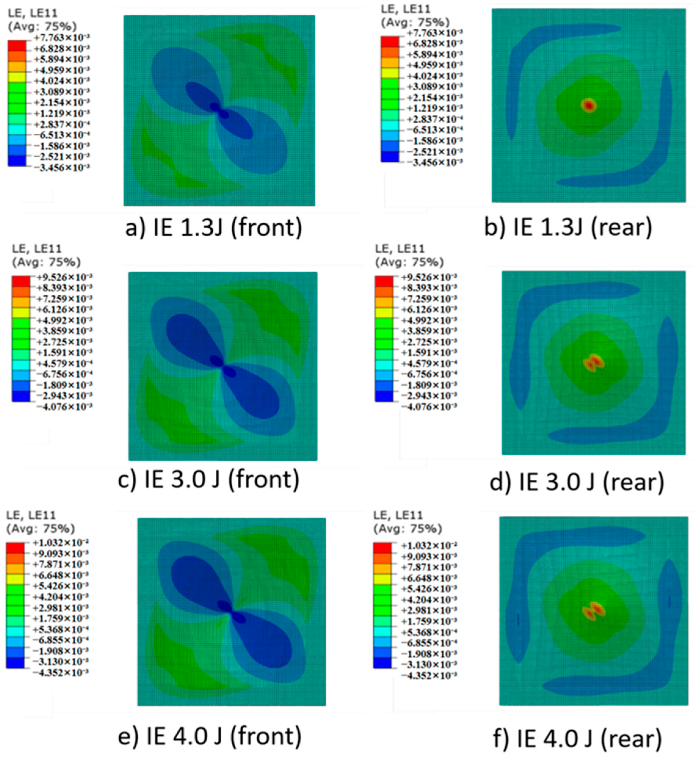 Figure 9 depicts the strain response of the composite material under varying IEs. It was observed that with an increase in IE, there was a corresponding gradual increase in the strain of the CL. At an IE of 1.30 J, the strain in the composite ranged from −3456 μ to 7763 μ. When the IE is elevated to 7.00 J, the strain extended from −4586 μ to 12,250 μ. Notably, the compression strain on the front side exhibited a smaller increase compared to the more significant increase in the tensile strain on the rear side. The patterns of strain distribution remained consistently similar across the various IEs.