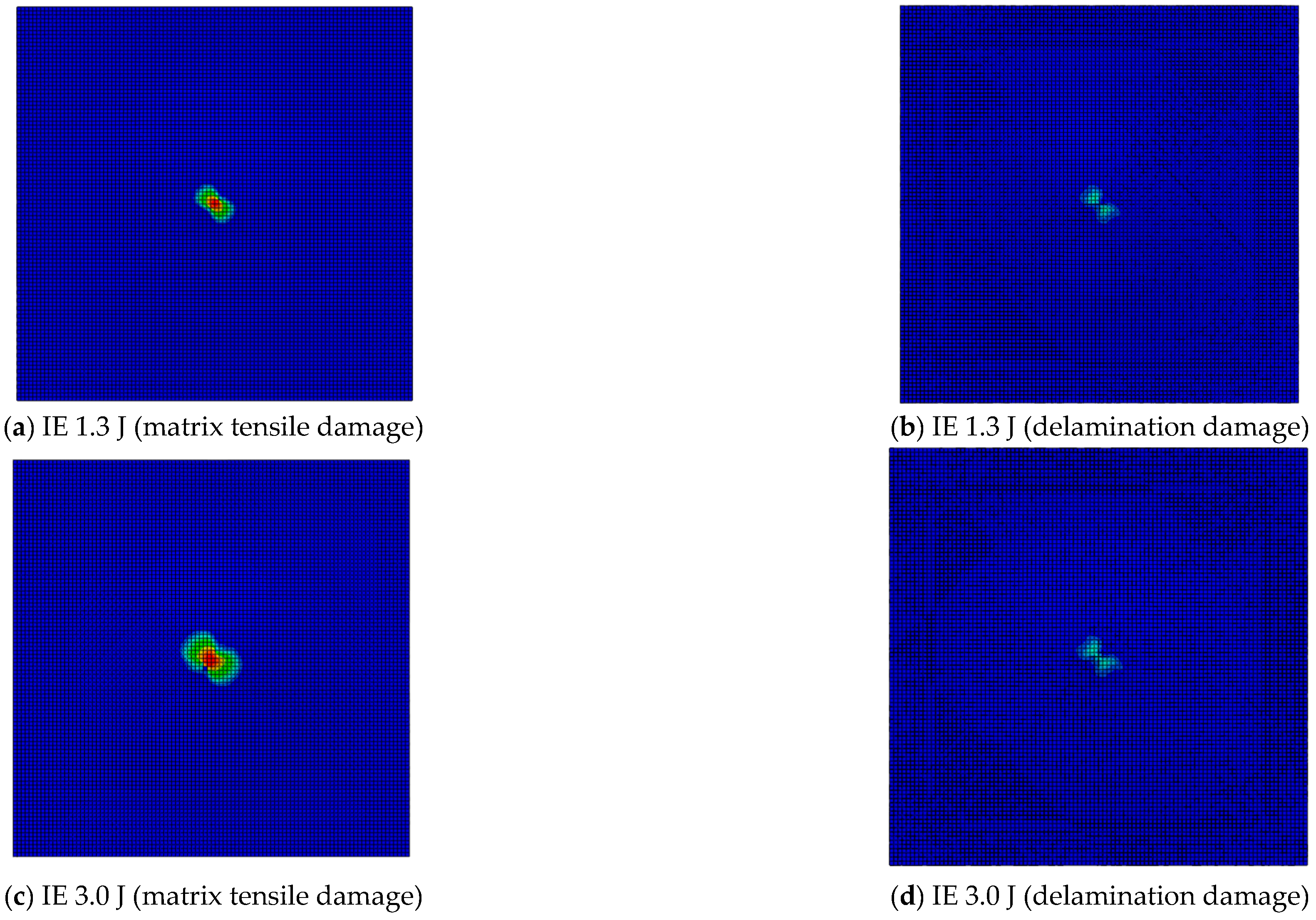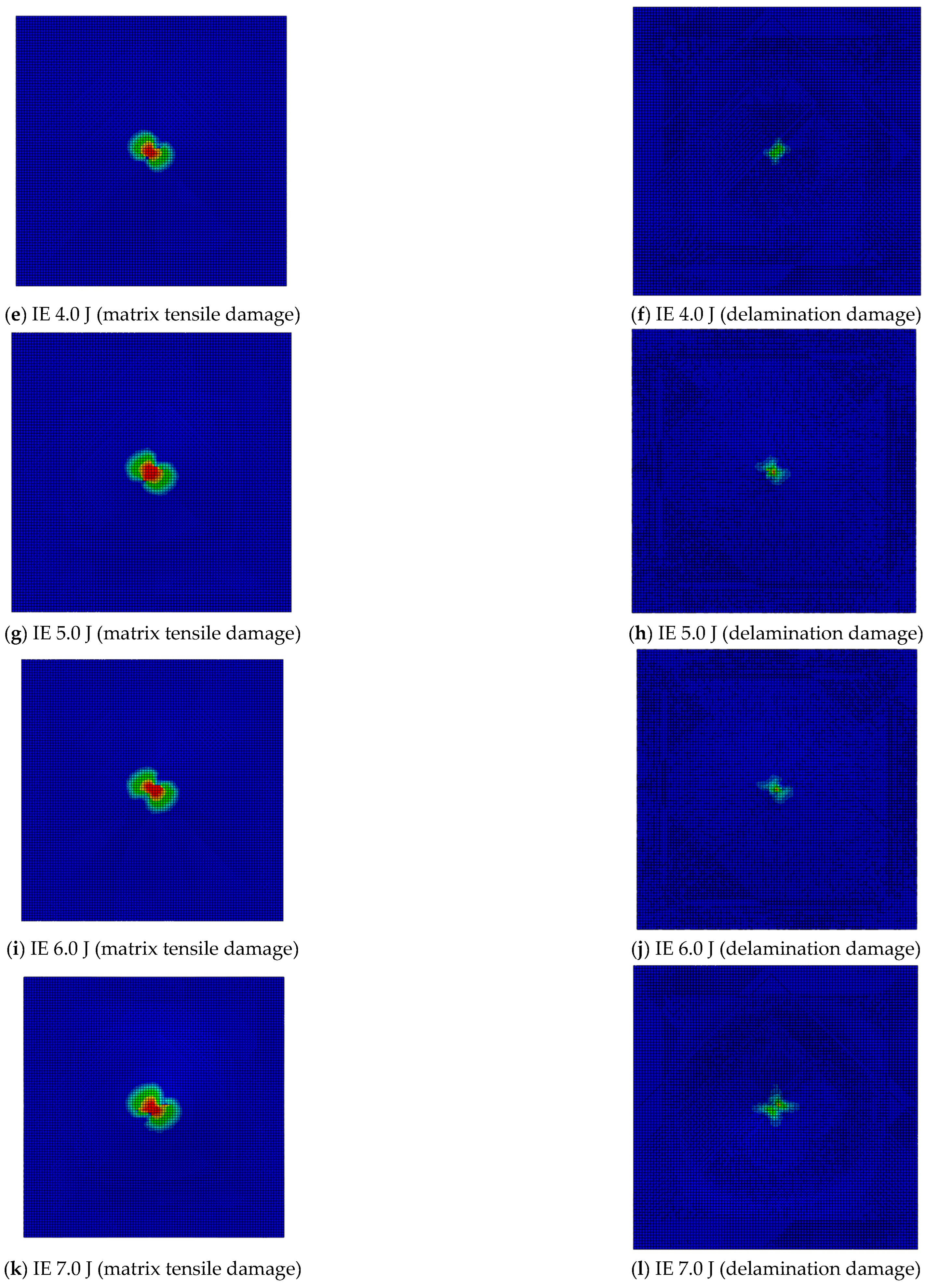 Figure 10 depicted the matrix tensile damage and delamination damage of the composite material under varying IEs. It was observed that the delamination damage of the CL increased with an increase in IE. At an IE of 1.30 J, the area of matrix tensile damage in the composite was zero. When the IE is elevated to 3.0 J, 4.0 J, 5.0 J, 6.0 J and 7.0 J, the area of matrix tensile damage in the composite extends to 24 mm2, 38 mm2, 84 mm2, 96 mm2 and 119 mm2. This indicated that when the impact energy was less than 1.3 J, no matrix damage occurred in the composite panel. When the impact energy exceeded 3.0 J, matrix tensile damage began to appear in the CL, with the damaged area increasing as the impact energy rise. While no delamination damage or fiber damage occurred in the CL when the impact energy ranged between 1.3 J and 7.0 J.