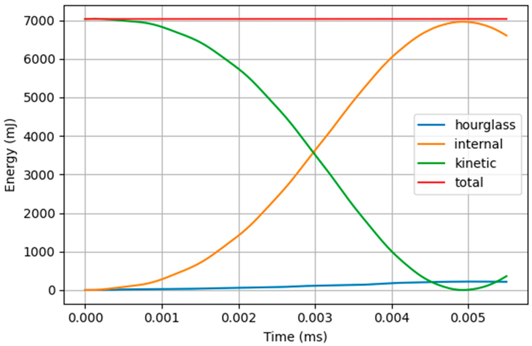 Figure 11 depicted the energy history plot of the composite material under IE = 7.0 J. It was observed that the total calculation time was 6 ms, and the total energy remains constant at 7 J. As time increased, kinetic energy gradually decreased while internal energy gradually increased. The hourglass energy was significantly smaller than the internal energy, indicating that the energy results from the simulation were reasonable and credible.