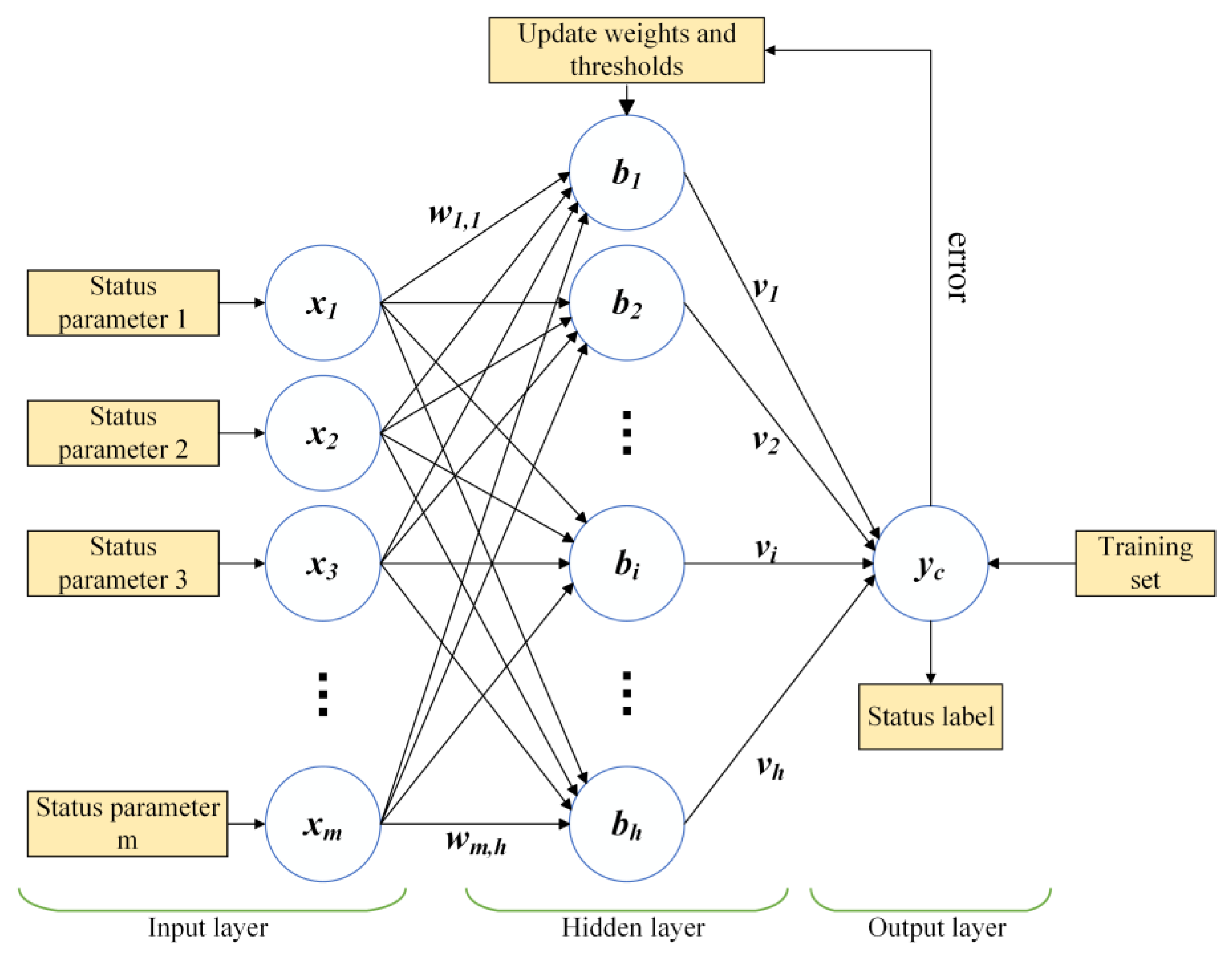 The back propagation neural network (BPNN) is composed of an input layer, a hidden layer, and an output layer. During training, the network iteratively adjusts the weights and thresholds to minimize the discrepancy between the predicted outputs and the actual status labels. Key parameters for constructing a BPNN include the number of neurons in the hidden layer, error threshold, number of iterations, and learning rate.