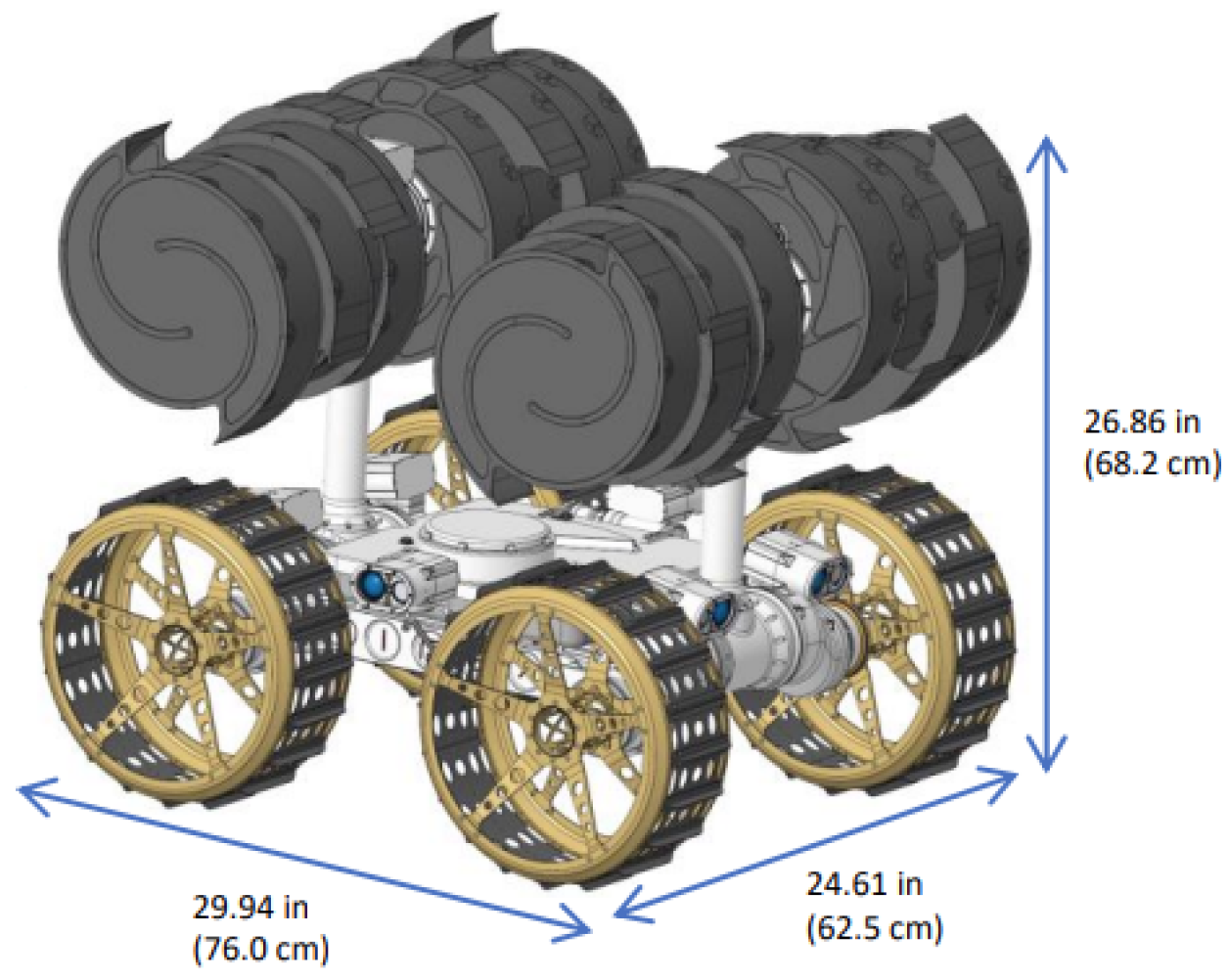 | Navigate and move within environment; Deploy from launch vehicle | Differential 4-Wheel Drive and 6-Wheel Rocker-Bogie | RB + MM | The RB will require limited mobility, such as for deploying from the launch vehicle, which can be achieved by a simple differential 4-wheel drive mobility system. The 6-wheel rocker-bogie suspension system has been implemented on the Mars Science Laboratory, Mars Exploration Rovers, Pathfinder, and Perseverance. The latest iteration includes 4 individually steerable front and back wheels, allowing the vehicle to swerve, make arcing turns, and turn 360 degrees in place. This flexibility in steering would enable the MM to enter any necessary configurations for manipulation [198,200]. | |