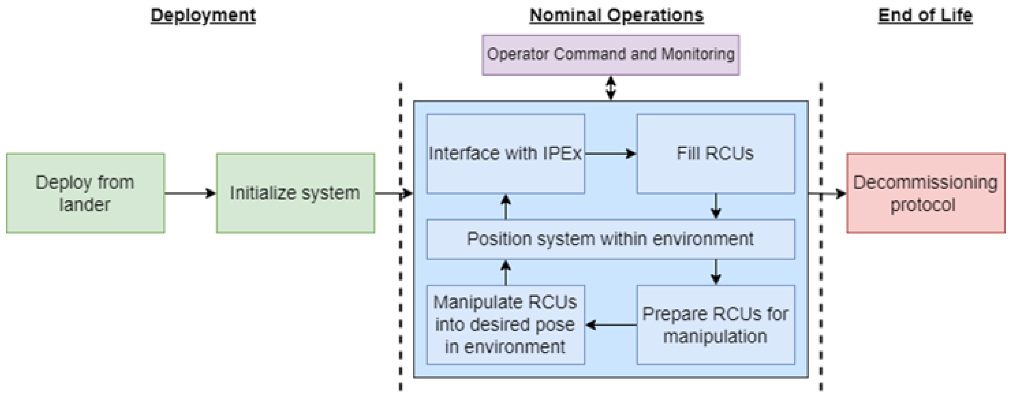 | Intake Lunar Regolith | Deploy Empty RCU | Interface with and Secure RCU | Transport RCU to Desired Pose | |