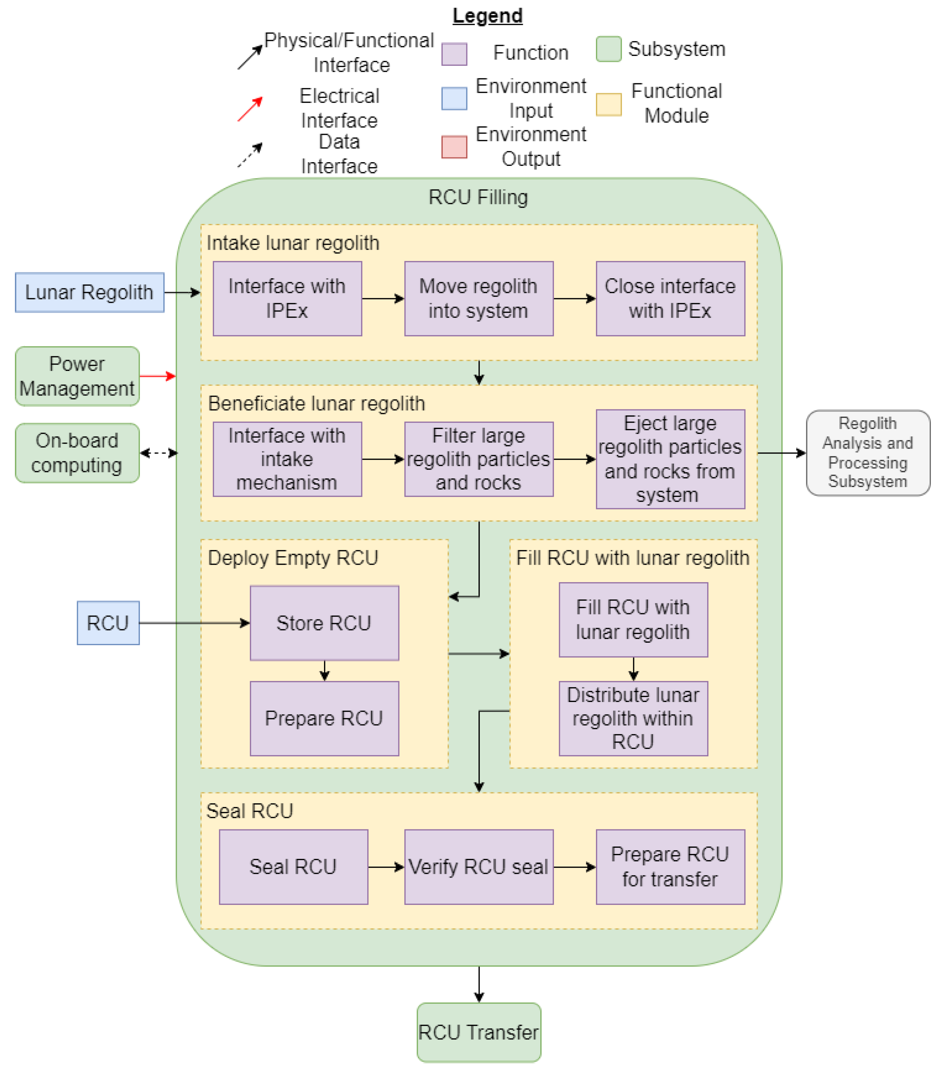| SYS-F-03 | transfer excess regolith to a third-party Regolith and Analysis Processing Subsystem. |