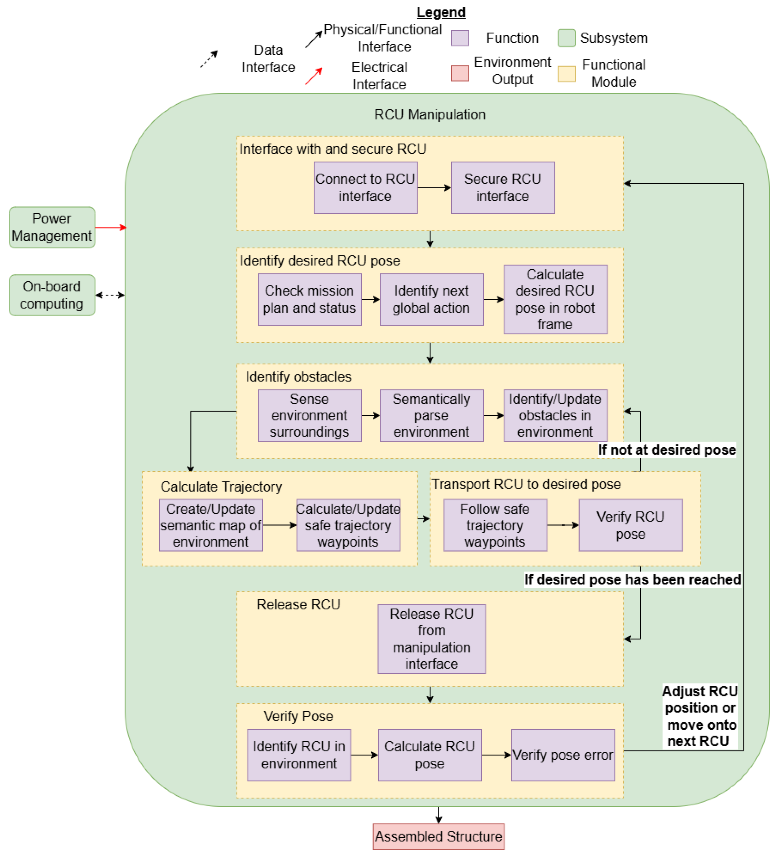 | Identify desired RCU pose; Calculate trajectory; Identify obstacles; Verify Pose | Sensors and CPU # 2 | MM | The MM CPU will need to process and fuse sensor data to construct a map of its surroundings for path planning and localization. This is essential for both the manipulation and MM trajectory generation. The specific sensors necessary for this task require further investigation. | |