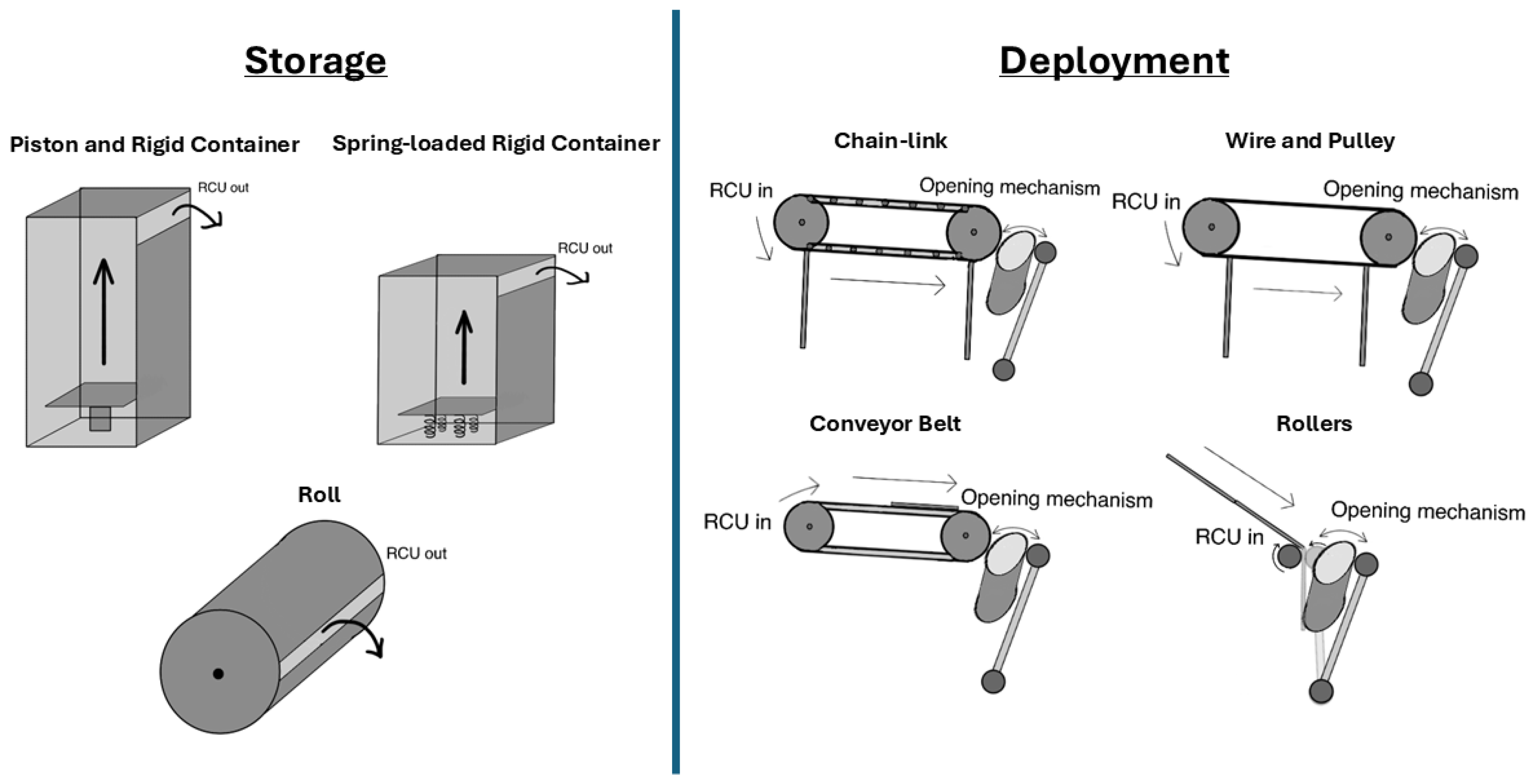 | Seal RCU | Thermal sealing | RB | Thermal sealing is a common strategy in industrial bagging processes, and allows for fewer moving parts as compared to other methods like sewing or folding. The sealing bar can be integrated into the opening mechanism and rollers of the Deploy Empty RCU R-R configuration [212,213,214]. | |