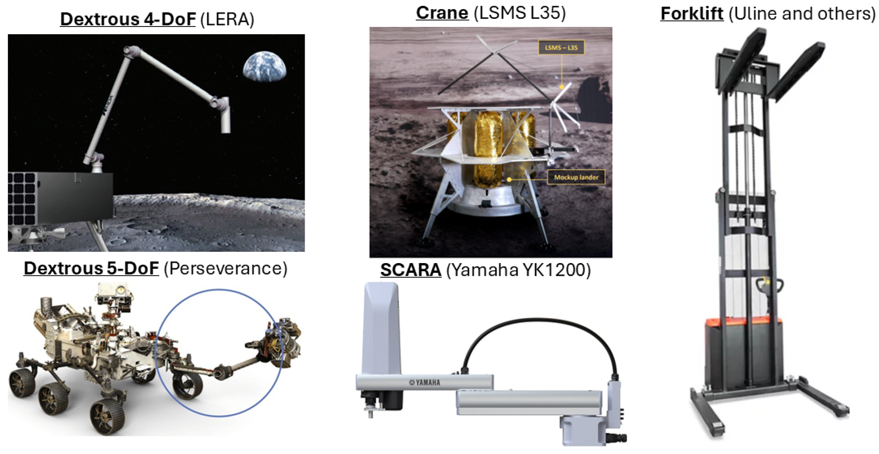 | ID | RI () | 4-DoF | 5-DoF | SCARA | Forklift | Crane |