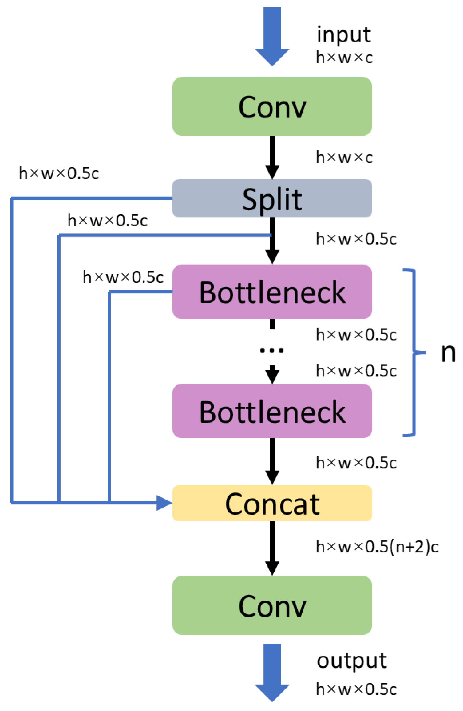 The C2f module executes feature transformation on incoming data via two convolutional layers. By concatenating features derived from separate branches along the channel dimension, it facilitates the integration of these features. The resulting concatenated features, which incorporate details from diverse branches, serve to enhance the descriptive capability of the feature representation. The structure of C2f is shown in Figure 2.