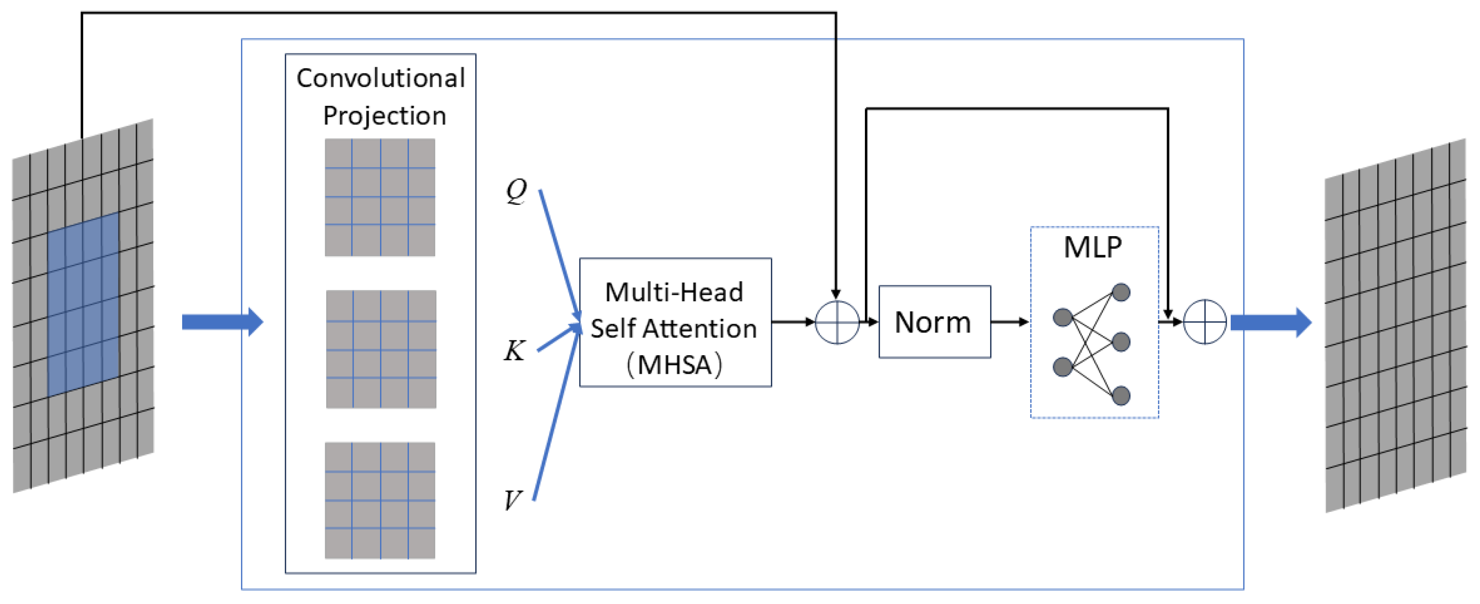 The canonical Transformer module primarily comprises a multi-head self-attention (MHSA) mechanism and linear layers. The MHSA computes global relationships among sequence tokens via query–key–value interactions and further learns these global features through linear networks. However, the standard Transformer module may exhibit the following limitations: (1) the pure Transformer architecture directly slices and encodes input images, which hinders the extraction of fine-grained visual details; (2) the computational burden and memory consumption of MHSA scale quadratically with spatial dimensions in Transformers, leading to substantial training and inference overheads. To enhance Transformer performance in visual tasks, this paper proposes a Convolutional Transformer (CT) network that integrates CNN and Transformer components where detailed architecture of CT is presented in Figure 3. CT shares the same topological structure as lightweight feature extraction modules but replaces their homogeneous multi-branch structures with self-attention mechanisms. This simplified design reduces the need for free hyperparameter selection, thereby improving model stability across diverse scenarios.