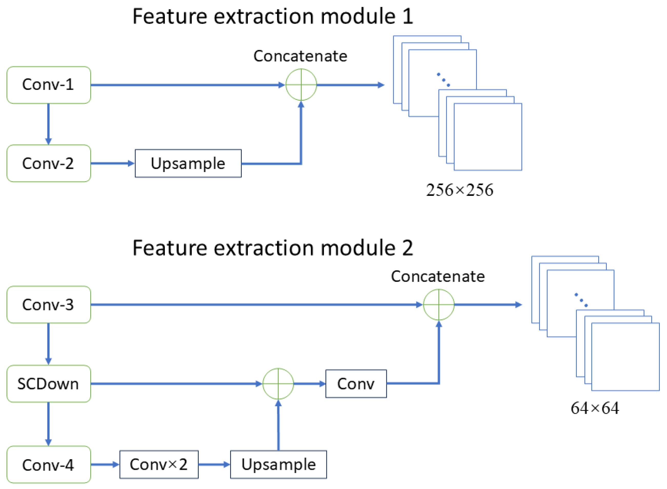 Within these components, Conv refers to the convolutional layer, primarily functioning for feature extraction tasks. In the present study, a 1 × 1 convolution kernel is initially employed to consolidate the channel-specific information from incoming features, thereby projecting these inputs into a lower-dimensional feature space—here, the channel count of the input features defines the dimensionality. To extract features from these reduced-dimensional feature maps, a multi-branch architecture utilizing 3 × 3 convolution kernels is adopted, with the channel dimension of each branch set to 1/32 of that in the original input feature maps. Following this, outputs from all branches are fused, and their features are combined through another 1 × 1 convolution kernel. To address gradient attenuation issues, this paper’s proposed methodology incorporates batch normalization (BN), which can be mathematically formulated as follows: