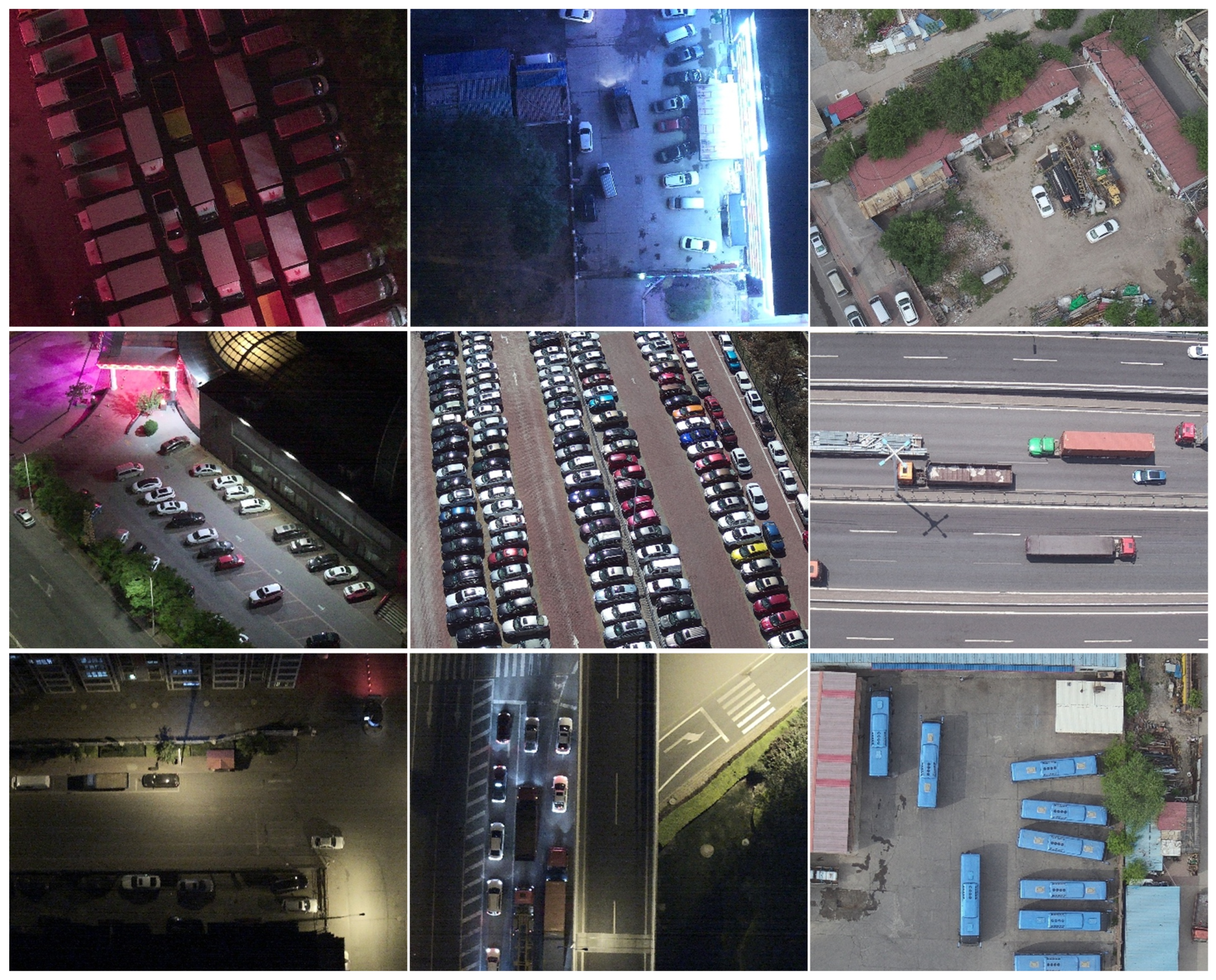 In this section, experimental investigations were performed on a UAV image dataset. The obtained results corroborated the validity of the theoretical analyses. These tests were executed on a server configured with 13th Gen Intel(R) Core(TM) i7-13700F CPU (Intel Corporation, Santa Clara, CA, USA) and NVIDIA GeForce RTX 4060 Ti GPU (NVIDIA Corporation, Santa Clara, CA, USA). To ensure fair comparison, all simulation results presented in this work were generated under standardized configurations: we adopted a batch size of 1, utilized FP32 precision for model inference, developed the framework based on PyTorch 2.1.1, and explicitly included non-maximum suppression (NMS) processing in the detection pipeline. Certain datasets commonly utilized in object detection tasks are grounded in natural scene environments, where their sample categories and feature distributions diverge notably from those of UAV imagery. Put differently, these datasets fail to capture the distinct characteristics inherent to UAV-based object detection scenarios. To assess the performance of our proposed model in real-world UAV operational settings, we leveraged a collection of authentic UAV-captured images. This dataset encompasses diverse time periods, weather conditions, lighting scenarios, and complex backgrounds. Following sorting and annotation processes, a UAV image dataset comprising 15,000 images was compiled. In alignment with the detection requirements of UAVs in practical applications, these images were categorized into classes including background, freight car, van, bus, truck, and car; Figure 5 shows some examples of the dataset. As can be seen from the figure, the dataset contains UAV-captured images of various scenes under different time periods and lighting conditions. In the experiments of this section, 60% of the dataset was randomly selected as the training set, 20% as the validation set, and the remaining 20% as the test set. The hyperparameter settings for model training are shown in Table 1.