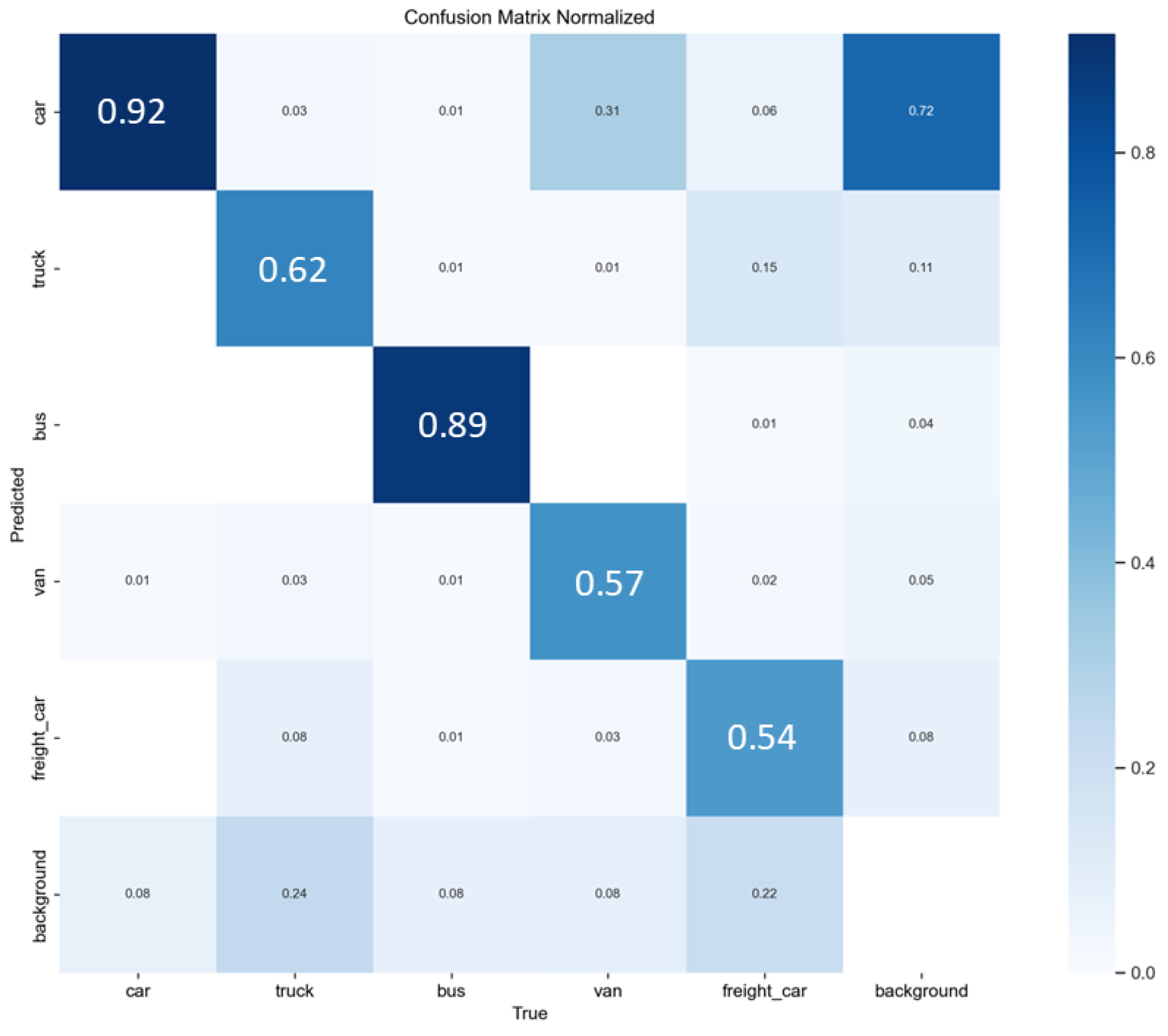During the training process, to effectively illustrate the trade-off between accuracy and recall at varying thresholds, this study employed the P-R curve to experimentally depict the recognition rates of different vehicle categories by validating the proposed DODT. As shown in Figure 6, the improved model exhibited enhanced detection accuracy across all categories, particularly for the “car” category, which reached 95.8%. Upon calculation, the model achieved an average accuracy of 80.5%. Subsequently, this section utilized the confusion matrix to assess the accuracy of the proposed model’s prediction results, as shown in Figure 7. In this confusion matrix, each column denotes the predicted proportion of each category, while each row corresponds to the true proportion of each category within the dataset. Analysis of the confusion matrix reveals that the prediction accuracies for the categories “car,” “truck,” “bus,” “van,” and “freight car” are 92%, 62%, 89%, 57%, and 54%, respectively, further confirming that the DODT algorithm demonstrates high accuracy across all categories in the drone image recognition dataset.