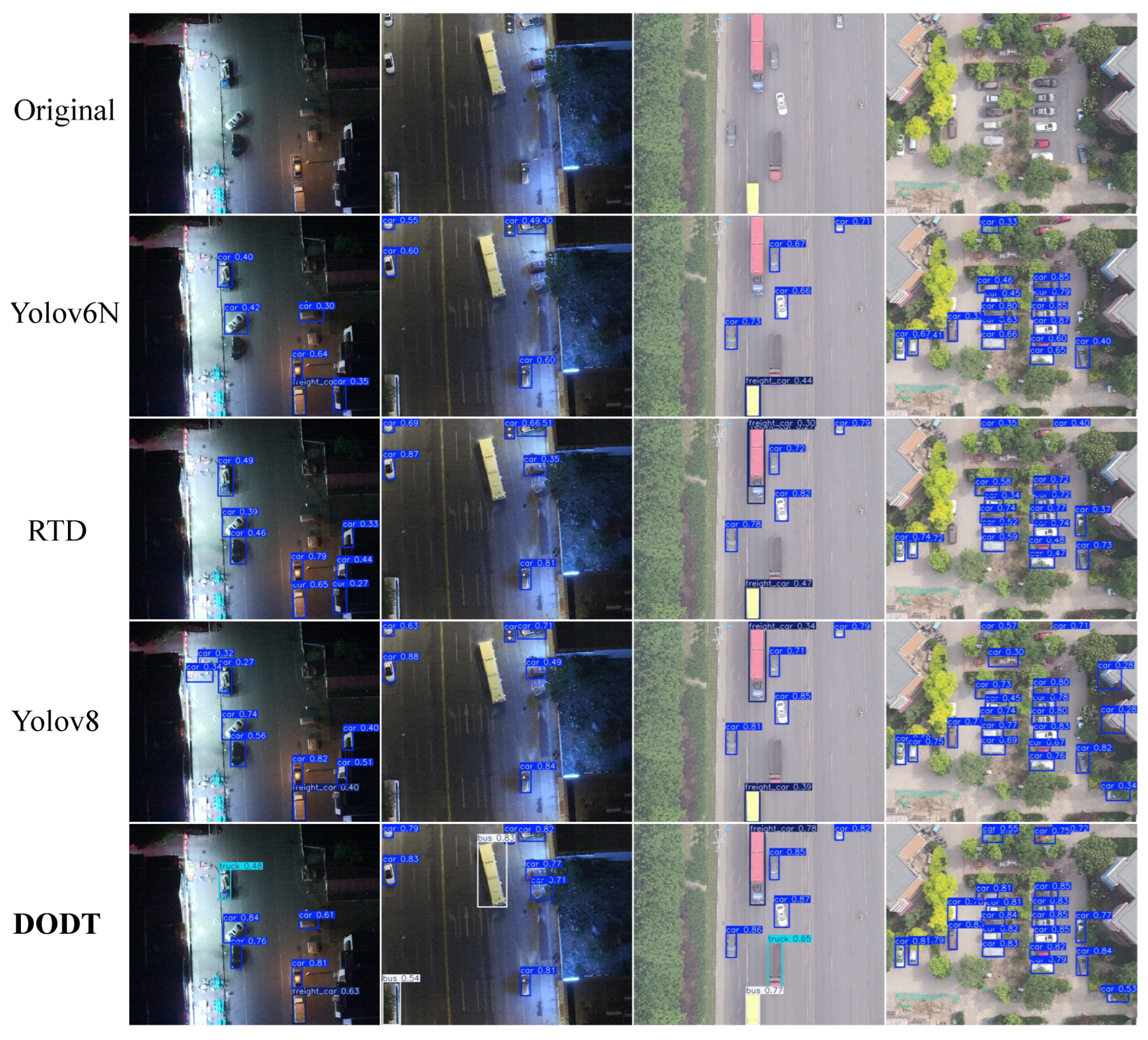 (3) Experimental evaluations on the COCO dataset demonstrate that DODT outperforms state-of-the-art detectors by achieving a 4.6% improvement in mean Average Precision (mAP) for small targets while maintaining competitive inference speed. These results validate the effectiveness of DODT in addressing the unique challenges of UAV-based urban inspection tasks, paving the way for more reliable and efficient smart city management systems.