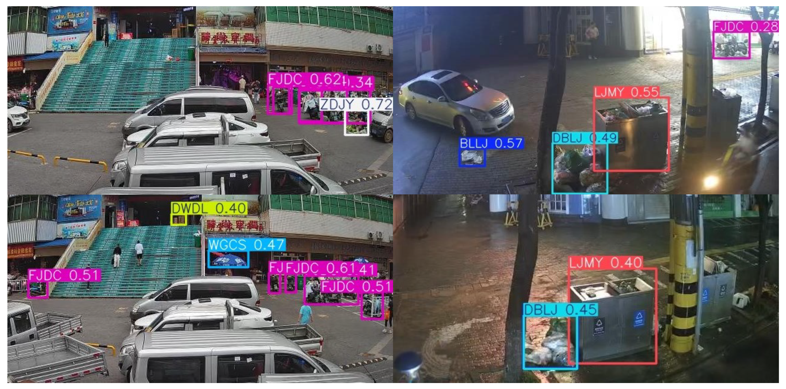 To further validate the efficacy of DODT in target detection for smart city applications, we deployed this model for special event identification within a localized smart city setting, utilizing the dedicated dataset specifically designed for detecting anomalous events in urban environments (DAEUE-dataset). Representative results from this practical implementation are depicted in Figure 9. As shown in the figure, DODT effectively detects diverse urban special events across complex city environments, including packaged waste (DBLJ), exposed garbage (BLLJ), road occupation (ZDJY), material stockpiles (DWDL), improper umbrella usage (WGCS), and non-motor vehicle violations (FJDC), demonstrating robust recognition capabilities in challenging real-world scenarios. DODT achieves 76.2% mAP on the DAEUE-dataset for urban anomaly detection, excelling in small-object tasks (e.g., waste piles, vehicle violations) with 68.5% mAP for sub-32 × 32 anomalies and a 6.3% small-target mAP lead over YOLOv8. This stems from its Transformer-based attention mechanism, which captures contextual dependencies in cluttered urban settings to ensure reliable detection of targets blending with backgrounds.