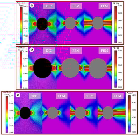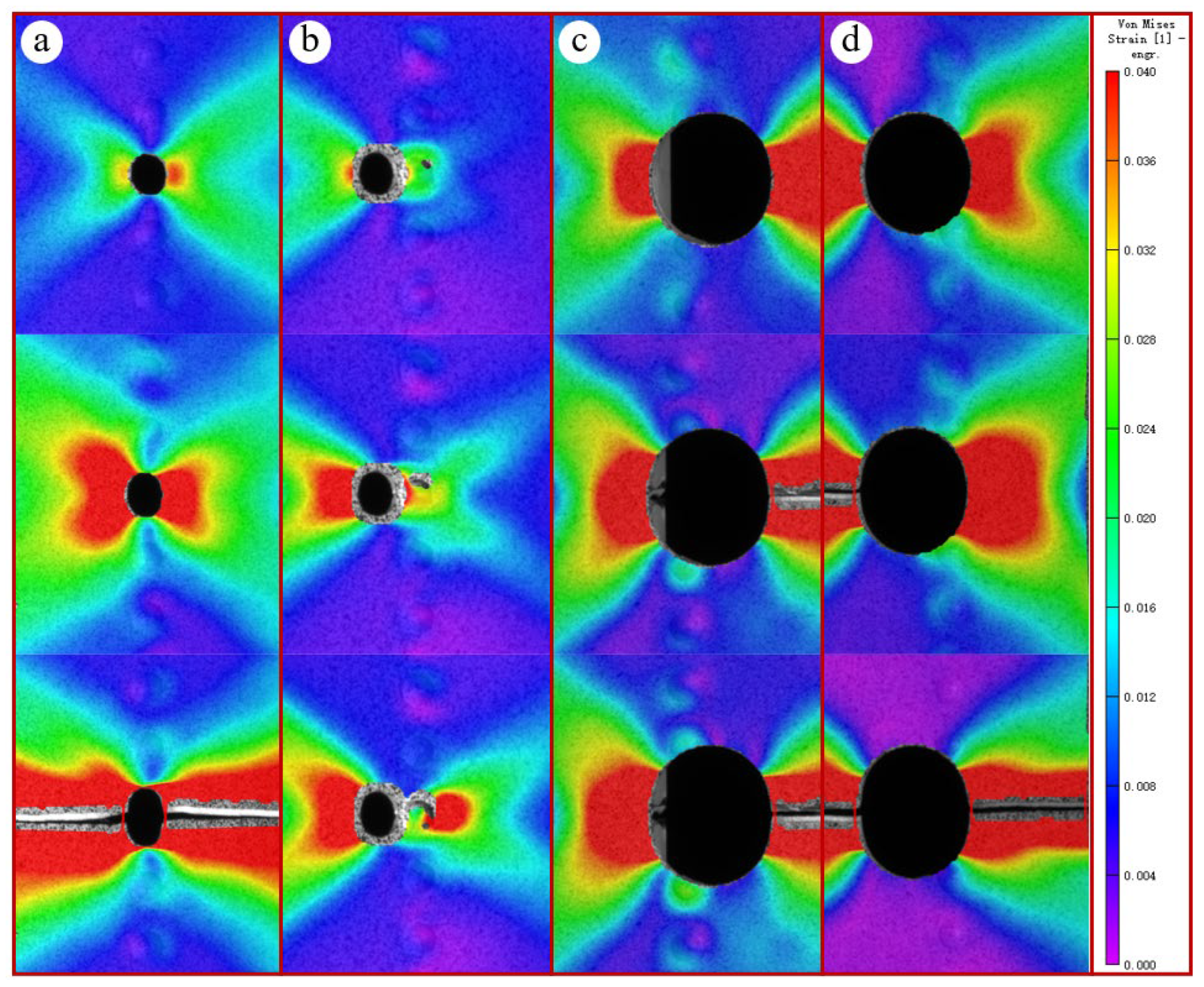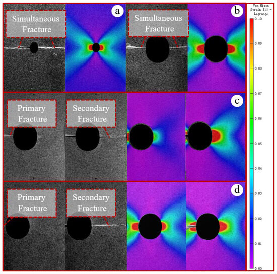 - For the panel specimen with a central hole, fracture occurs simultaneously on both sides due to uniform loading. In contrast, for the panel specimen with an eccentric hole, asymmetric constraints lead to stress concentration and strain release on the free side, resulting in the free side fracturing first, followed by the constrained side