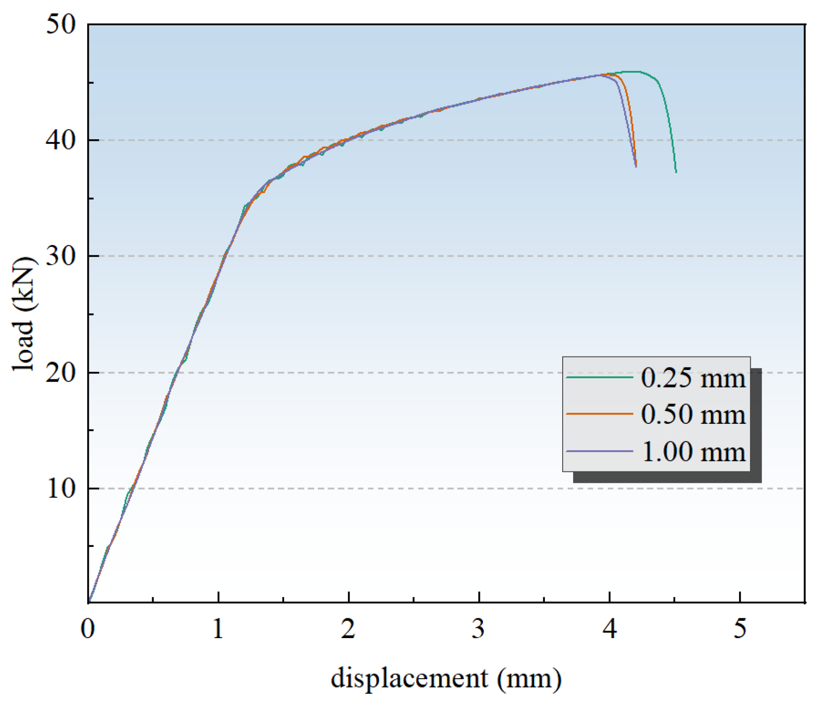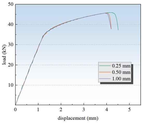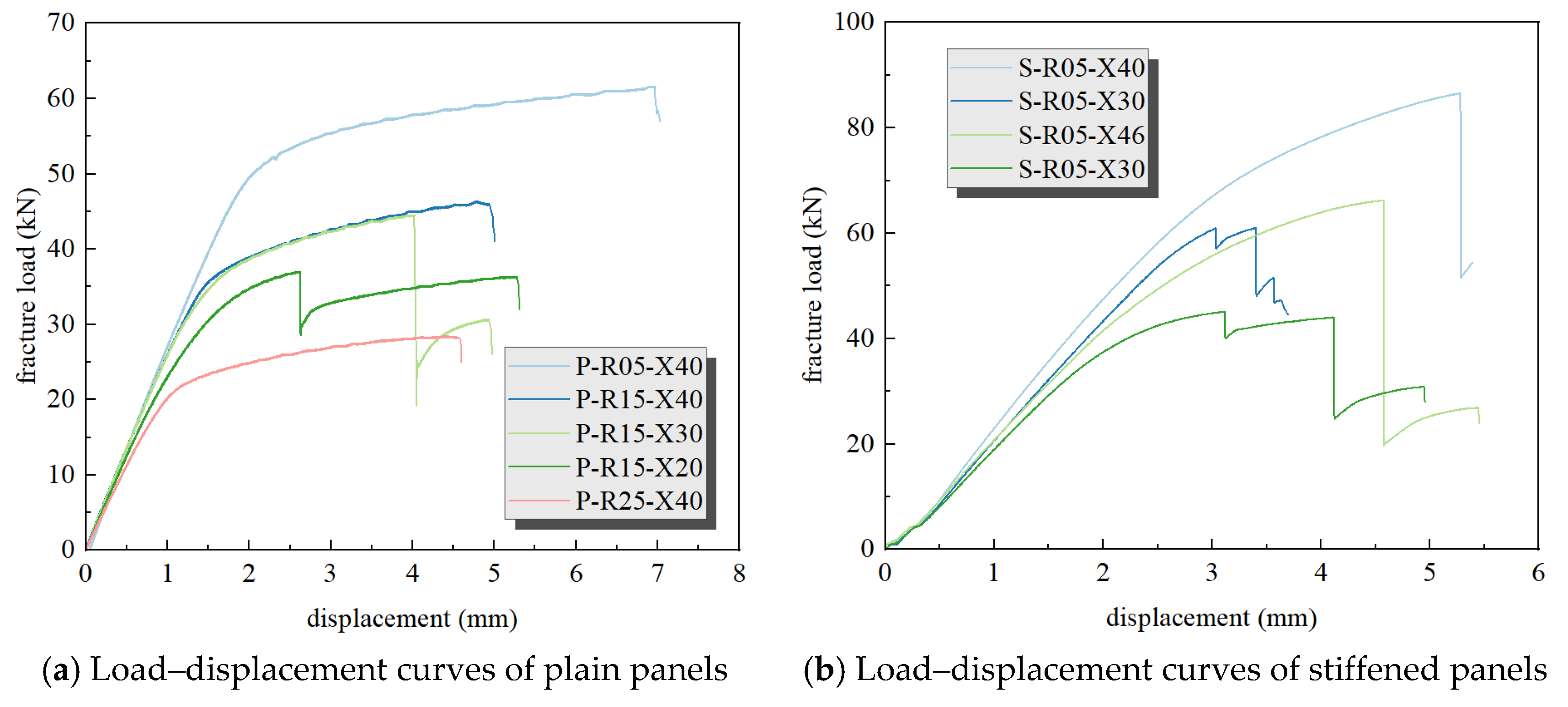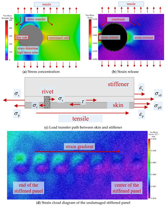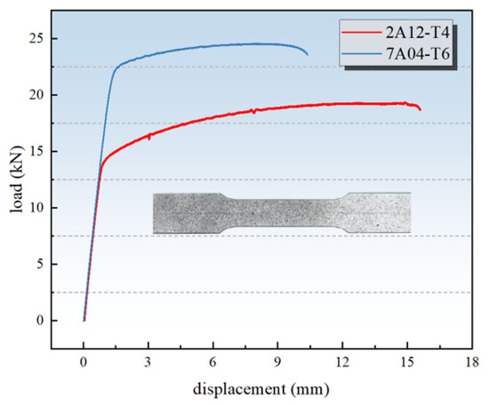 - The load–displacement curve for the stiffened panel specimen displays multiple load drops. Because the 7000-series aluminum alloy is more brittle than the 2000-series aluminum alloy, the stiffener fractures first under quasi-static tensile loading. Subsequently, the failure mode of the skin becomes consistent with that of the plain panel.