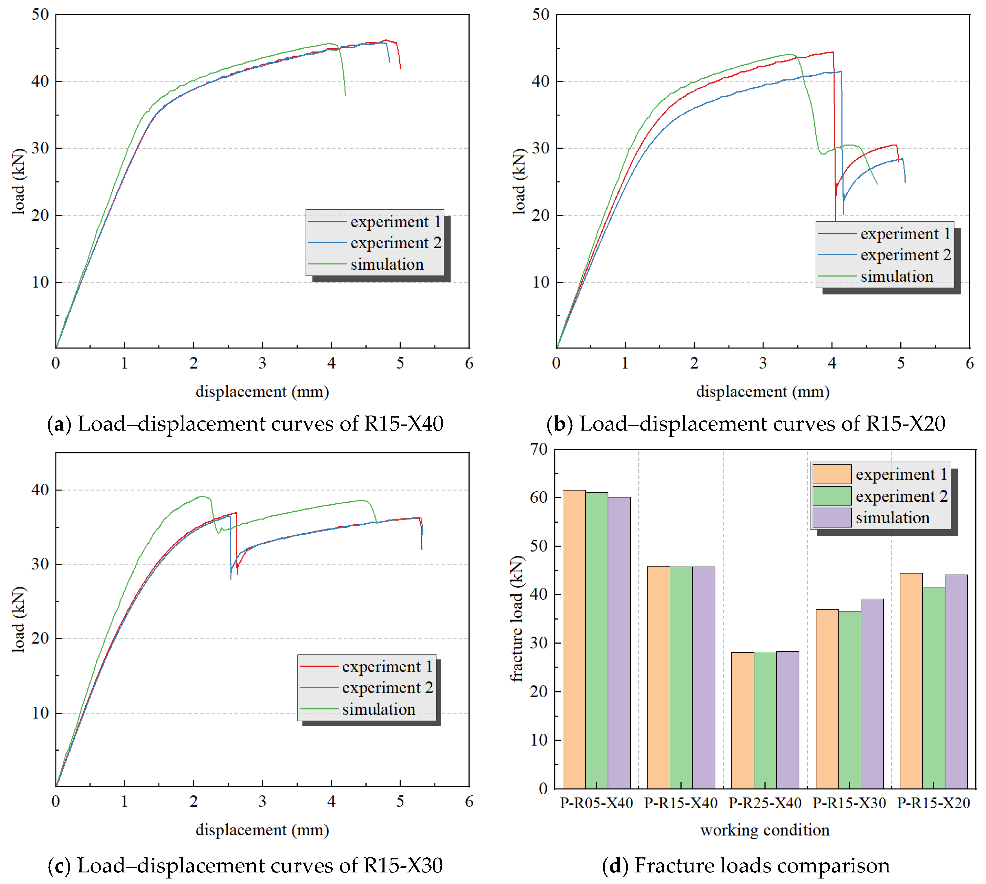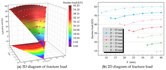 - The load–displacement curve for the centrally perforated panel exhibits only a single load drop. However, the load–displacement curve for the eccentrically perforated panel shows two load drops due to the sequential fracture of the panel material on either side of the hole. The relationship between these two fracture loads exhibits a dual-peak critical value, Xdual.