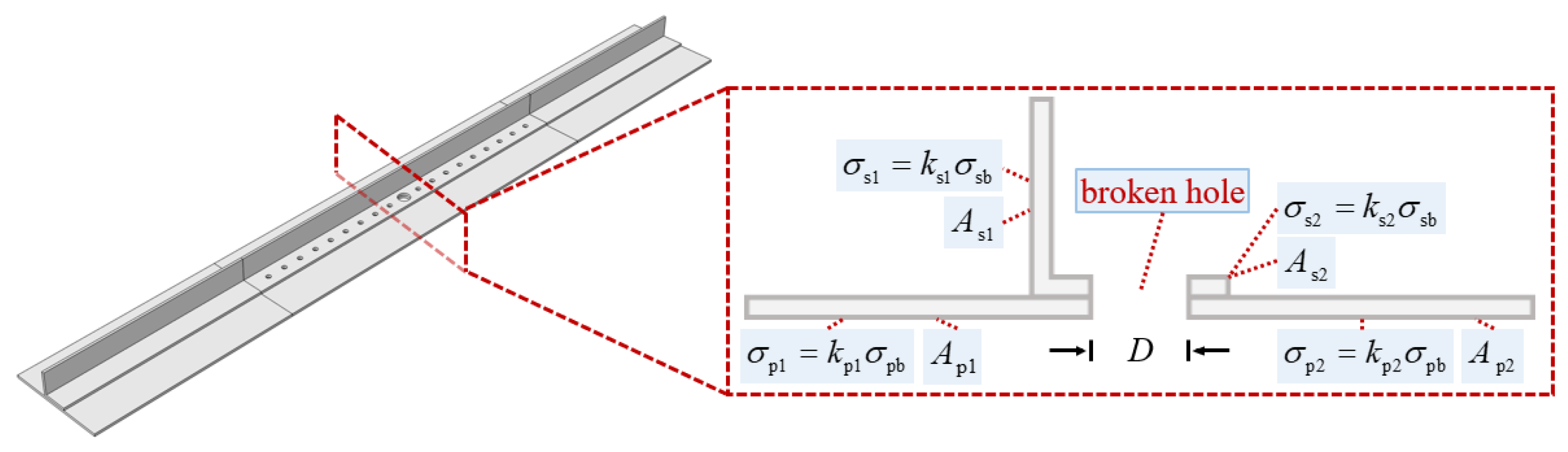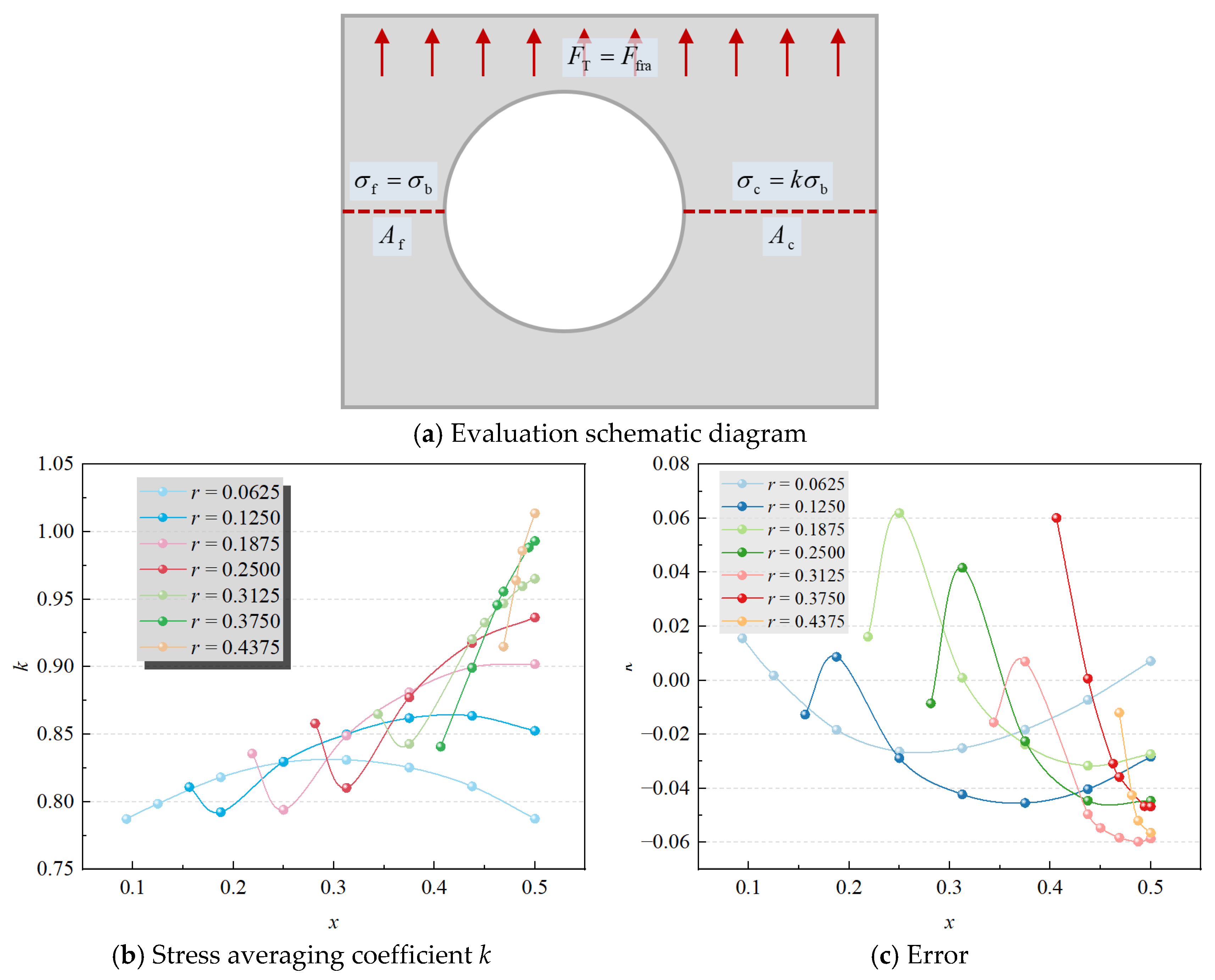 - The stress distribution is uneven across the two sides of the hole in eccentrically perforated panels. The Net Section Failure Criterion shows significant evaluation errors for these panels. Introducing a stress averaging coefficient (k) to modify the relationship between the Net Section Failure Criterion and the hole’s location and size improve the evaluation accuracy of the residual strength for perforated panels, with the maximum error reduced to 6.19%.