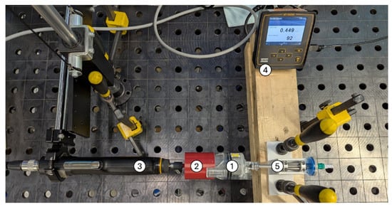 In order to select and calculate the necessary components for the mixing unit, data must first be collected to enable this design. For this purpose, torque tests are carried out with the MCM. After obtaining an approximate measuring range (0–3 Nm), a fitting test setup is developed. Since a measuring range of less than 3 Nm involves low torques, specialized and high-resolution measuring equipment is required to directly measure the dynamic torque during mixing. This equipment is located in the tightening laboratory of Atlas Copco Tools Central Europe GmbH in Essen and is extended by suitable fixing elements. The complete setup is shown in Figure 2.