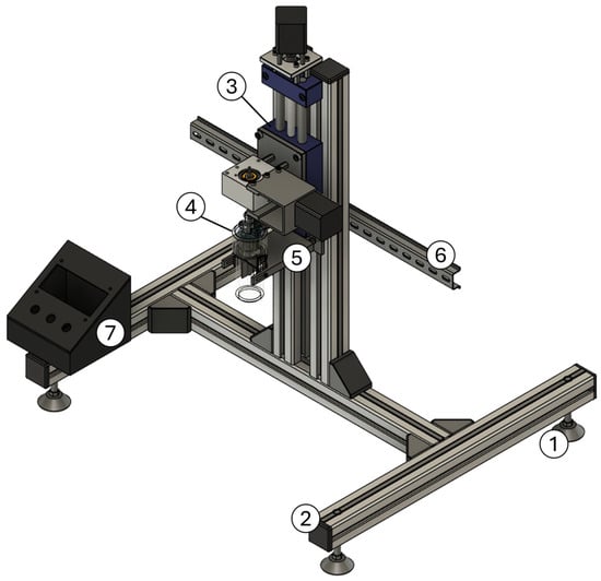 Once all the components identified in the parts list are available, the prototype can be built based on its digital twin. First, the frame is assembled by connecting the individual aluminum profiles with screws, T-nuts, and brackets. The feet are also mounted to ensure stability on the work surface, and then all the cover caps are added. The mixing unit can then be attached. The linear guide is screwed to the aluminum profiles, creating the distance between the two vertically positioned profiles. The remaining parts of the mixing unit are added accordingly. The bracket for the MCM is attached below the mixing unit, and the DIN rail for the electronic components is attached to the rear. The latter are then assembled—Arduino is inserted into a housing and connected to the DIN rail along with the 24 V power supply, the two motor controllers, and the terminals. The microswitches are glued to their brackets and screwed to the sides of the vertically positioned aluminum profiles. The display and buttons are screwed into the lid of the box, which in turn is connected to the box by means of pressed-in magnets. The final step is to wire all electronic components together, with the cables being routed through the grooves in the aluminum profiles and then covered with profiles.