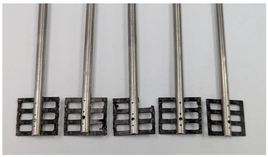Another problem became apparent after cleaning the components on the carbon mixer blades. Figure 7 shows all five mixer blades used for the nine test mixtures. The original plan was—as in the torque tests—to reuse as many MCM components as possible. However, the mixing process damaged a total of four of the mixer blades in the nine tests, meaning that each one had to be replaced with a new, undamaged one. The damage to the middle mixer blade was particularly severe; one of the ribs had broken off and is now embedded in the test specimen. With the exception of the blade on the far right, all the other blades showed damage on the sides, i.e., where there was only a small gap between the blade and the mixing chamber during mixing. This suggests that this damage is caused by the abrasive mechanisms of larger grains in the mixture compositions. However, since such damage did not occur during the qualification of the MCM in 2021 when conducting the experiments manually, it is necessary to investigate possible causes and how these can be ruled out.