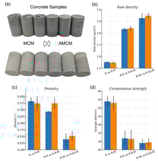(a) Concrete samples produced by MCM and AMCM (mixture R-R top row, mixture R-SS bottom row). Comparison of concrete sample properties, raw density (b), porosity (c), and compressive strength (d), for 18 samples of the mixtures R, R-R, and R-SS produced with the AMCM (blue bars) and R-M, R-R-M, and R-SS-M produced with the manual MCM (orange bars). Error bars correspond to the standard deviation.