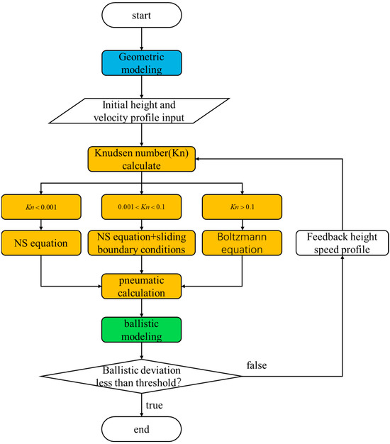 The aerodynamic iteration process involves conducting simulations based on shape reconstruction for aerodynamic analysis. Before performing these simulations, the Knudsen number is calculated, an appropriate simulation equation is selected, and aerodynamic coefficients are computed based on specific altitude and velocity conditions. These coefficients serve as inputs for ballistic modeling. If the ballistic deviation meets the required standards, the iteration process terminates; otherwise, altitude and velocity data from locations with significant deviations are used as feedback for further aerodynamic computations. This modeling approach generates simulated trajectory curves that closely resemble real flight conditions, thereby improving flight state parameters. It supports missile simulations targeting moving objects and provides crucial assistance for modeling the precise trajectory of hypersonic vehicles.