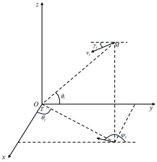 Next, a terminal guidance model is developed. In the terminal guiding phase, the missile executes real-time adjustments to ascertain the target’s location, considering their relative motion in three-dimensional space, as illustrated in Figure 2 [25,26,27].