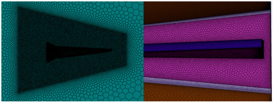 Pneumatic simulations for high-hypersonic flights are performed in this work using a turbulence model, a pressure-based implicit method, a two-temperature model, FMG initialization (which rapidly solves a simplified flow problem on a coarse mesh and then uses that approximate solution as the initial condition for progressively finer meshes), far-field pressure inlet boundary conditions, and a hexahedral basin mesh. Key computations include the CL, CD, L/D ratio, and pitch moment coefficient, along with α ranging from −15° to 30° in 2.5° increments for each altitude condition. It is noteworthy that the grid design must accommodate shock wave formation in hypersonic flow; therefore, the grid size is approximately 1 mm in the nozzle and control surface regions and 7 mm for the body grid. The fluid domain’s grid growth factor is set at 1.2. A densified region is, thus, created around the model based on its flow field to enrich the simulation of shock waves. The grid height for the initial layer is determined by assessing variations in altitude and velocity to effectively partition the grid. At an altitude of 0 km, the height of the first grid layer is 1.03218 × 10−6 m. The final body grid utilizes a polyhedral grid, which more effectively simulates hypersonic flow. The grid details can be seen in Figure 4. A grid independence verification indicates that the grid demonstrates no significant variations in CL at around 10 million grid points.