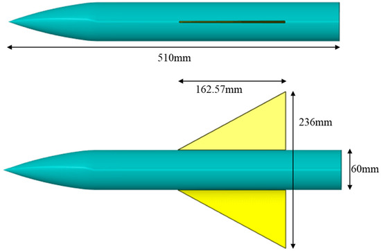 AGARD-B is a hypersonic aerodynamic methodology validation model that can be clearly distinguished from Mars-16B based on its geometric structure. Verification experiments were conducted to assess the accuracy of an aerodynamic method using the AGARD-B standard aerodynamic validation model. The data for the AGARD-B model corresponded to a Mach number of 5, a Reynolds number of 10.7 × 106, a temperature of 216.65 K, a pressure of 12,576.8 Pa, and range varying from 0° to 12° in 2° increments. The AGARD-B model is illustrated in Figure 5, Blue represents the body of the projectile, while yellow indicates the fins [30].