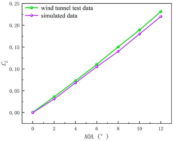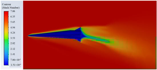 Numerical simulations were performed in strict accordance with the outlined boundary conditions, utilizing a second-order scheme, while maintaining the convergence error below an acceptable threshold of 10−4. Figure 6 presents a comparison of CL obtained from both wind tunnel measurements and numerical models. The maximum discrepancy between the simulated and experimental data is observed to be 4.3%, which confirms the effectiveness of the algorithm developed in this study for simulating hypersonic flow.