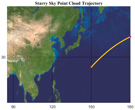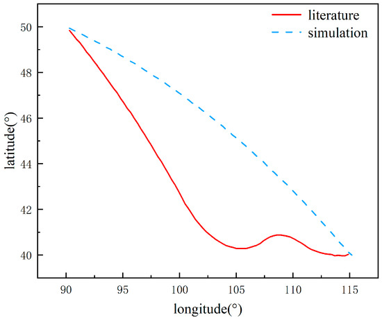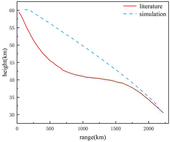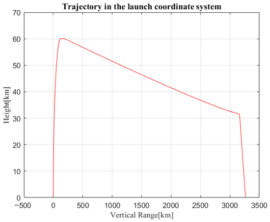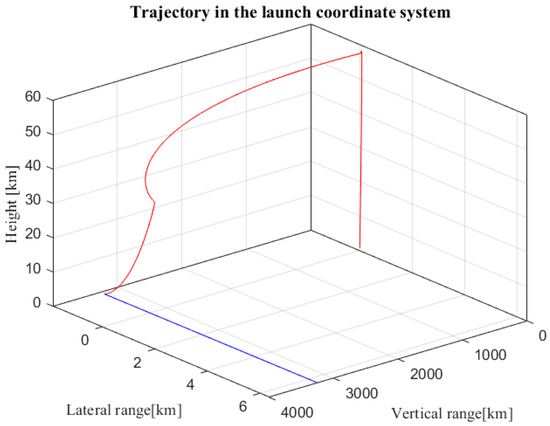 The outcomes of the ballistic modeling are presented in Figure 13 and Figure 14. Figure 13 illustrates the ballistic trajectory within the launch coordinate system. The missile was initially launched to its apex, stabilized, and then glided, eventually entering the guidance phase, where it exhibited pronounced lateral maneuvering control. The modeling results indicate that the ballistic curve aligned with the actual flight trajectory of a hypersonic vehicle and accurately reflected the ballistic curve. These results also encompassed the target’s mobility. During the terminal guidance phase, the missile’s trajectory diverged significantly due to the target drifting at a velocity of 17 m/s. The missile adjusted its trajectory through real-time modifications of the angle of attack and bank angle, with the convergence of the two trajectories signifying successful guidance and target annihilation. Figure 14 depicts the flyover to the target point in the Pacific Ocean, with a total range of approximately 3300 km, which aligns with a standard tactical strike range. The smoothness of the ballistic trajectory demonstrates effective altitude control during the balanced glide phase.