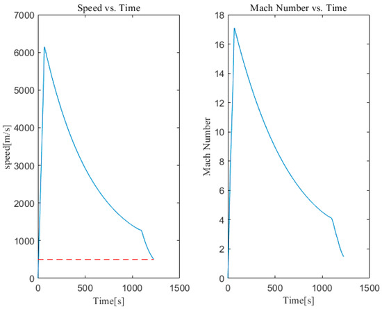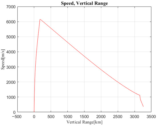 Aerodynamic properties substantially impact ballistic characteristics, and the outcomes of ballistic calculations, particularly those involving high-velocity profiles, subsequently influence the input parameters for aerodynamic assessments [8]. The trajectory of a hypersonic flying vehicle is modeled using ballistic equations that take into account factors such as the launch point, target point, and the missile’s bank angle. This modeling helps to initially determine the trends in flight altitude and velocity, as shown in Figure 7 and Figure 8, respectively.
