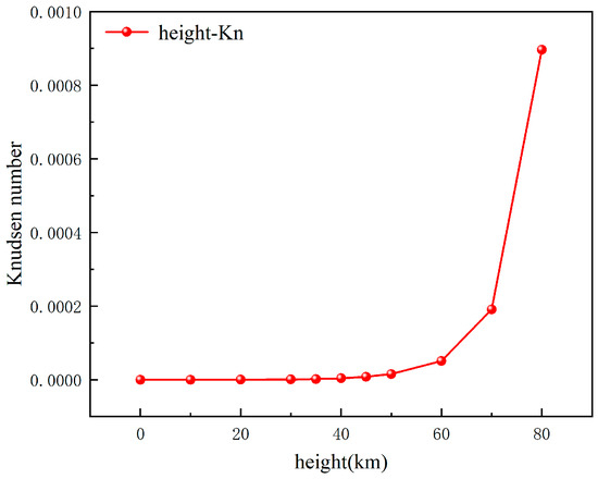 To compute the Knudsen number at different altitudes, 35 km as a reference altitude point has been used in this work. At this point, the Boltzmann constant , temperature , molecule diameter , pressure , average molecular free path , model characteristic length , and Knudsen number . With these values, it may be concluded that the N-S equations are applicable for computations at 35 km. The Knudsen number pertinent to aerodynamic iterations was also determined, with the findings demonstrating that the N-S equations hold true for calculations at all altitudes listed in Table 2. The trend in the Knudsen number can be seen in Figure 9.