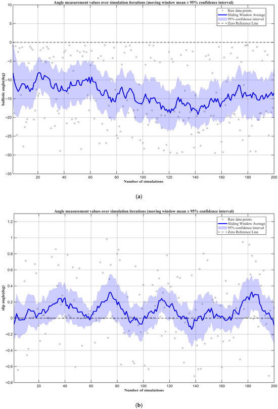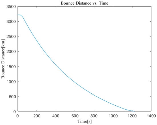 Figure 15 illustrates the dynamic response attributes of the control system through multi-dimensional parameter correlation. The parameters include yaw angle, ballistic inclination angle, ballistic deflection angle, angle of attack, and sideslip angle. Analyzing this data enhances our understanding of the missile’s flight conditions. During the boost phase, acceleration fluctuated significantly but stabilized in the glide phase, while the missile’s angle transitioned smoothly before achieving stability. The aerodynamic data indicated that the aircraft maintained a high L/D ratio for an α range between 5 and 15°, which was crucial since the aircraft spent most of its flight time within this range, ensuring excellent maneuverability. The red box in Figure 15b indicates a sharp change in angle, where the vehicle transitions from the boost phase to the glide phase, and then from the glide phase to the terminal guidance phase. Figure 16 depicts the variation in distance between the missile and its target, confirming the terminal precision of the guiding algorithm from a mission perspective. When the vertical coordinate reached zero, it was inferred that the target was struck.