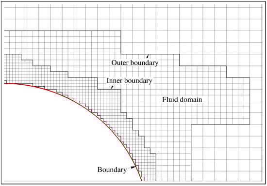 The hybrid immersed boundary method is proposed to combine the advantages of the diffused IB method and the cut-cell method [37]. In this method, macroscopic variables at boundary grid nodes are reconstructed from the surrounding domain nodes without ghost grids so that an external force is implicitly imposed and the boundary is resolved as a sharp interface [34,37]. The velocity boundary condition is usually of the Dirichlet type or the Neumann type, and an interpolation could be used in the reconstruction of velocity [38,39]. In contrast, the density or pressure at physical boundaries is usually of neither the Dirichlet type nor the Neumann type, i.e., both their values and/or gradients at boundaries are not explicitly prescribed. In many steady high Reynolds number applications with thin boundary layers, this problem is omitted by assuming a Neumann boundary condition, i.e., , but this might not be applicable for relatively low Reynolds numbers, unsteady flows, and/or moving boundaries. In these cases, the Poisson equation is usually solved for the required pressure [38,40].