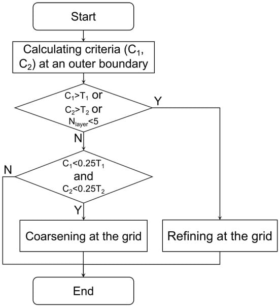 Solution-adaptive grid algorithm. and are threshold values for the adaptive criteria and , respectively.