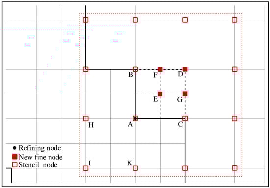 The flow information at the newly added coarse nodes and the fine nodes that coincide with coarse ones is reconstructed from the coinciding nodes through the information synchronization mechanism between two grid blocks introduced in Section 2. For the newly added fine nodes not coinciding with coarse ones, the flow information is reconstructed through quadratic polynomial interpolations from that at the surrounding coarse nodes within the range of two grid spacings (if a coarse node is missing, the coinciding fine one will be used, e.g., H, I, or K). The regular and well-centered stencil is favorable for smooth and stable interpolations. Still, the information synchronization mechanism is applied before the interpolations.