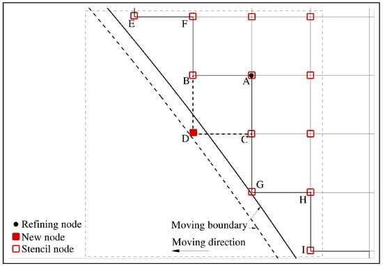 The moving boundary-adaptive grid processes are directly simplified from the above solution-adaptive ones by taking the boundary grids as the inner boundary of the block and ignoring the fine grid-related operations. As demonstrated in Figure 4, the processes are triggered when a moving boundary sweeps over a Cartesian node (e.g., D). The node will be deleted if it is already in the fluid area. Otherwise, it will be added as a new node. The flow information at a new boundary grid node is reconstructed using the proposed immersed boundary treatment detailed in the next section (i.e., Section 4).