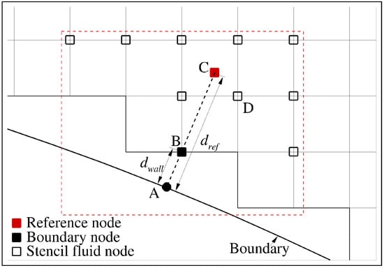 Since the physical constraint in Equation (12) includes velocity and its gradient (e.g., the viscous term), they are reconstructed before . As shown in Figure 5, following Ref. [32], a reference point (e.g., C) immersed in the fluid domain normal to the boundary with a distance is introduced to assist the macroscopic reconstruction. The required macroscopic flow information at the boundary grid node B is calculated using that at the reference point C and the perpendicular projection A.