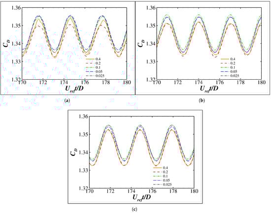 Time histories of the drag coefficient for different exponents ((a) 1.0., (b) 1.5., and (c) 2.0.) and threshold values (). Results are shifted within half a vortex shedding period to present in phase.