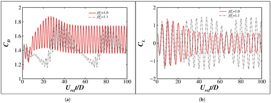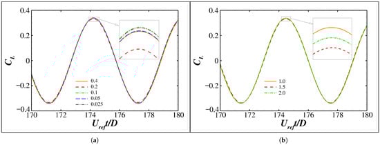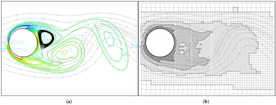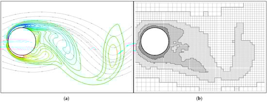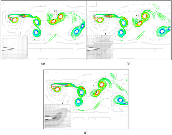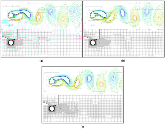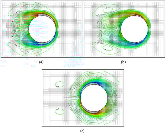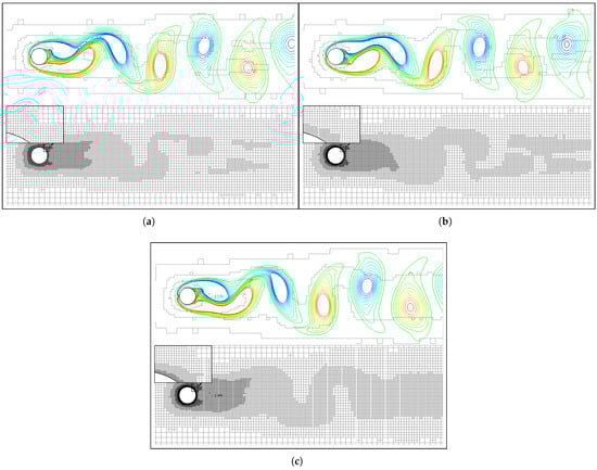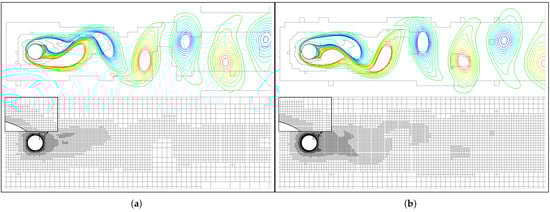 Figure 6 and Figure 7 show time histories of the resulting lift () and drag () coefficients, respectively. In general, both and are only slightly affected by the varying parameters. However, observable high-frequency disturbance of can be observed in Figure 6a when the exponent is 1.0 and the threshold value is . The high-frequency disturbance is associated with vorticity contours not smoothly resolved using relatively coarse grids (see Figure 8a). The problem is then effectively removed by increasing the exponent to ≤1.5 and/or decreasing the threshold value to (see Figure 6, Figure 8 and Figure 9).