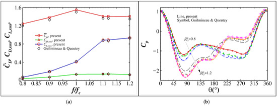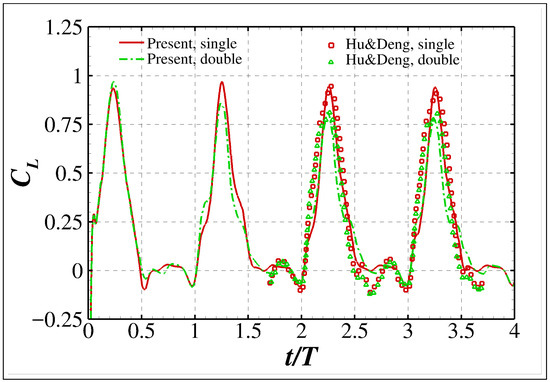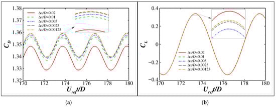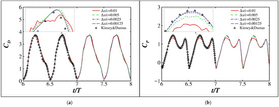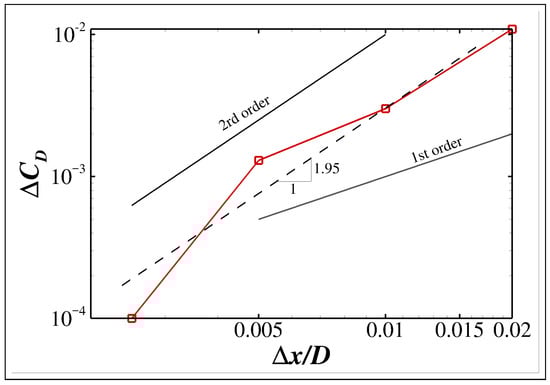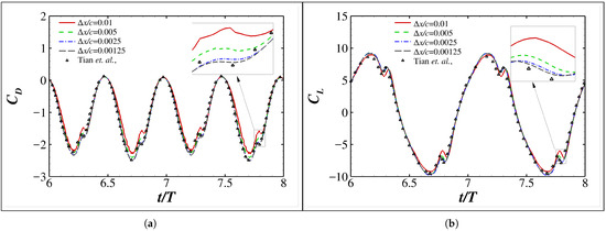 Figure 11a,b show time histories of the drag coefficient () and the lift coefficient (), respectively. Both and are smoothly resolved and converge favorably, with the minimum grid spacing continuously halved. Clear asymptotic behaviors of and are achieved for (see Figure 11a,b). Moreover, as shown in Figure 12, the time-averaged drag coefficient converges at a super-linear rate of about 1.95 when the minimum grid spacing decreases. It should be noticed that this convergence is different from the conventional grid convergence because the decreased minimum grid spacing is only a local refinement near the boundary. Therefore, the nearly quadratic convergence rate is more related to the second-order accurate hybrid IB method proposed in Section 4. In addition, all the data shown in Table 1, including the vortex shedding Strouhal number, time-averaged , and oscillating amplitudes of and , show good agreement with those reported from different studies.