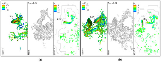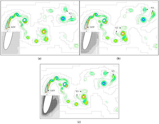 The flow characteristics as well as the adaptive grid distributions are shown in Figure 26. As can be seen, due to the effective grid adaptability, the multiscale vortical structures induced by the flapping wings are resolved with high resolutions. In particular, the attached leading edge vortices (LEVs), which are responsible for the high values of maximum around shown in Figure 25, as well as their attenuation due to the fore–hindwing interaction, are clearly captured in the simulations.