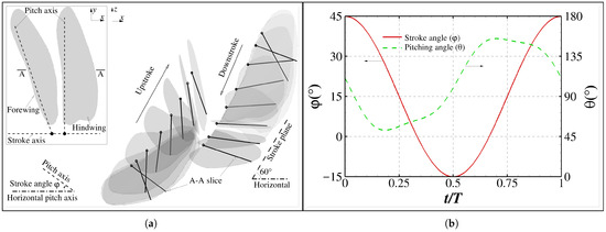 In order to validate and assess the simultaneous grid adaptability of the proposed method for multiscale flow induced by complex moving boundaries in a 3D context, two tandem dragonfly wings flapping in a hovering flight are simulated. The wing geometries [50] (see Figure 24a) and flapping kinematics [51,52] (see Figure 24b) measured from real dragonflies are adopted in the simulations. According to these natural measurements, the wings have spans of about 5 cm and mean chord lengths of about 1 cm and flap at a frequency of 36 Hz within a stroke plane at an angle of to the horizontal plane (see Figure 24a). Moreover, the forewing and the hindwing flap with a phase difference of [51]. As illustrated in Figure 24a,b, both stroke and pitching motions are performed, with kinematics determined as