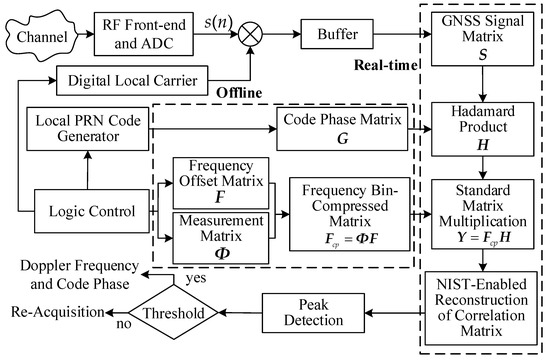 Since both the code phase matrix and the frequency bin-compressed matrix can be developed offline and prestored in the registers of GNSS receivers, the real-time compressive acquisition of GNSS signals involves the following four procedures: (1) calculating the column-wise Hadamard products between the GNSS signal matrix and the code phase matrix ; (2) performing the standard matrix multiplication between the frequency bin-compressed matrix and the code phase mask matrix ; (3) employing the measurement matrix and a reconstruction algorithm to reconstruct the correlation matrix by columns; (4) estimating both the code phase and Doppler frequency in the reconstructed correlation matrix via the peak detection and threshold comparison.