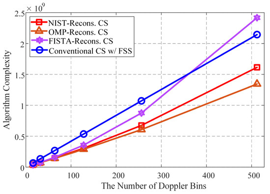 Given that FISTA still needs iterations to promote the solution sparsity and seek the global optimum, the minimum number of iterations is typically equal to five [34]. As such, it is readily observed from Table 1 that the computational complexity of the NIST-reconstructed CS algorithm is lower than that of the FISTA-reconstructed CS algorithm. However, due to the additional multiplication operations originating from the shrinkage–thresholding operation, a slight increase in the computational complexity of the NIST-reconstructed CS algorithm occurs, in comparison with the OMP-reconstructed CS algorithm. As the sparse representations of the NIST-reconstructed CS algorithm fundamentally differ from the conventional CS algorithm with FSS, a direct comparison of their computational complexities is not obvious in Table 1. The relationship between computational complexity and the number of Doppler bins for various CS algorithms is illustrated in Figure 2, where the sampling length of the PRN code and CR are set to 2046 and 1/2, respectively. As shown in Figure 2, the computational complexity of the NIST-reconstructed CS algorithm is obviously lower than those of the FISTA-reconstructed CS algorithm and the conventional CS algorithm with FSS. When the number of Doppler bins is equal to 256, the computational complexity of the NIST-reconstructed CS algorithm is reduced by 43% and 31%, respectively, compared with the FISTA-reconstructed CS algorithm and the conventional CS algorithm with FSS. However, compared with the OMP-reconstructed CS algorithm, the computational complexity of the proposed algorithm slightly increases by <10%.