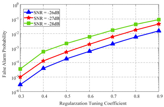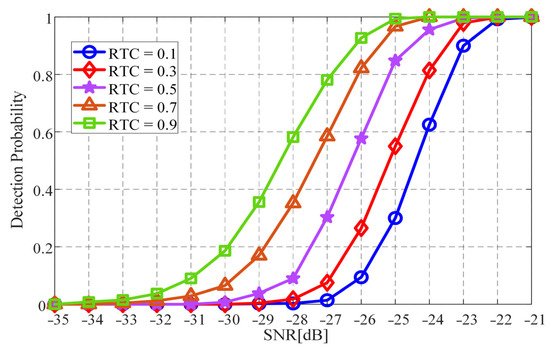 For investigating the effects of RTC on the acquisition performances of the NIST-reconstructed CS algorithm, Figure 3 shows the measured detection probabilities as a function of SNR for different RTCs. In obtaining Figure 3, the CR and Doppler frequency are set to 1/2 and 180 kHz, respectively, whilst the RTC ranges from 0.1 to 0.9 with a step size of 0.2. The decision thresholds of PSR are determined by a false alarm probability of 10−4. As can be seen from Figure 3, for different RTCs, the detection probabilities exhibit a typical “S”-shaped increase with an SNR rise and increases with the increasing RTCs. When RTCs are equal to 0.1, 0.5, and 0.9, the SNR thresholds at a detection probability of 90% are −23 dB, −24.5 dB, and −26.2 dB, respectively. This is mainly attributed to the enhanced noise suppression capabilities associated with the increasing RTCs. However, as analyzed in Section 3.2, the back-projection of the observed matrix inevitably introduces an additional coherent interference due to the relaxed ETF constraints. Therefore, an increase in RTC leads to a higher false alarm probability, as shown in Figure 4, where the false alarm probabilities versus RTC are illustrated for three representative SNRs. In obtaining Figure 4, each individual false alarm probability is measured via 106 Monte Carlo simulations whilst the false alarm probability is given by the ratio of the number of false acquisitions, with a detected peak accompanied by the misaligned code phases and/or incorrectly estimated Doppler frequency, to the total number of Monte Carlo simulations. As depicted in Figure 4, the RTC gives rise to almost the same developing trends of the false alarm probability for three SNRs, indicating that the effects of RTC on the false alarm probability of the NIST-reconstructed CS algorithm are independent of the received SNR. For a typical SNR of −27 dB, an increase in RTC from 0.3 to 0.9 causes the false alarm probability to rise from 1 × 10−5 to 4 × 10−2. Moreover, for a fixed RTC, the false alarm probability increases with the decreasing SNR. This is due to the fact that a lower SNR results in an increased probability of the noise energy peak being misinterpreted as the shrinkage threshold for the shrinkage–thresholding operations. In addition, it is interesting to find that, when RTCs are larger than 0.3, the false alarm probability experiences a nearly linear increase with the growth of the RTC, regardless of the SNR. When the RTC increases from 0.4 to 0.9, the false alarm probability for an SNR of −28 dB (−26 dB) increases from 5 × 10−4 (4 × 10−5) to 9 × 10−2 (1 × 10−2). Such a uniform characteristic of the RTC-associated variation in the false alarm probability is desirable for relaxing the design requirements of the GNSS receivers [42].